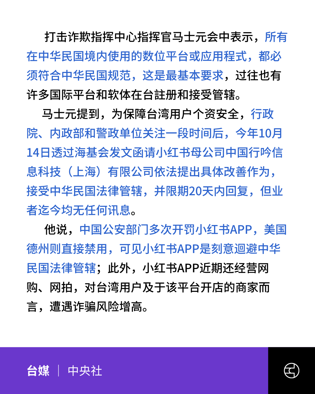 台湾官员在记者会上表示,曾多次致函小红书但从未获回复,可见是刻意迴避中华民国法律管辖。