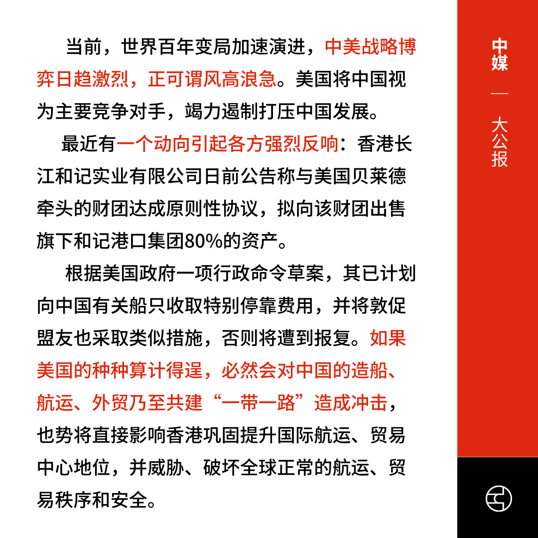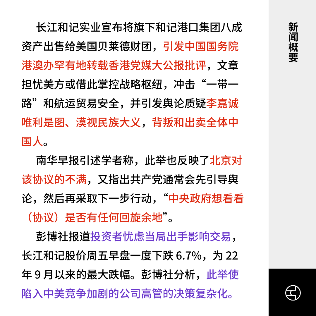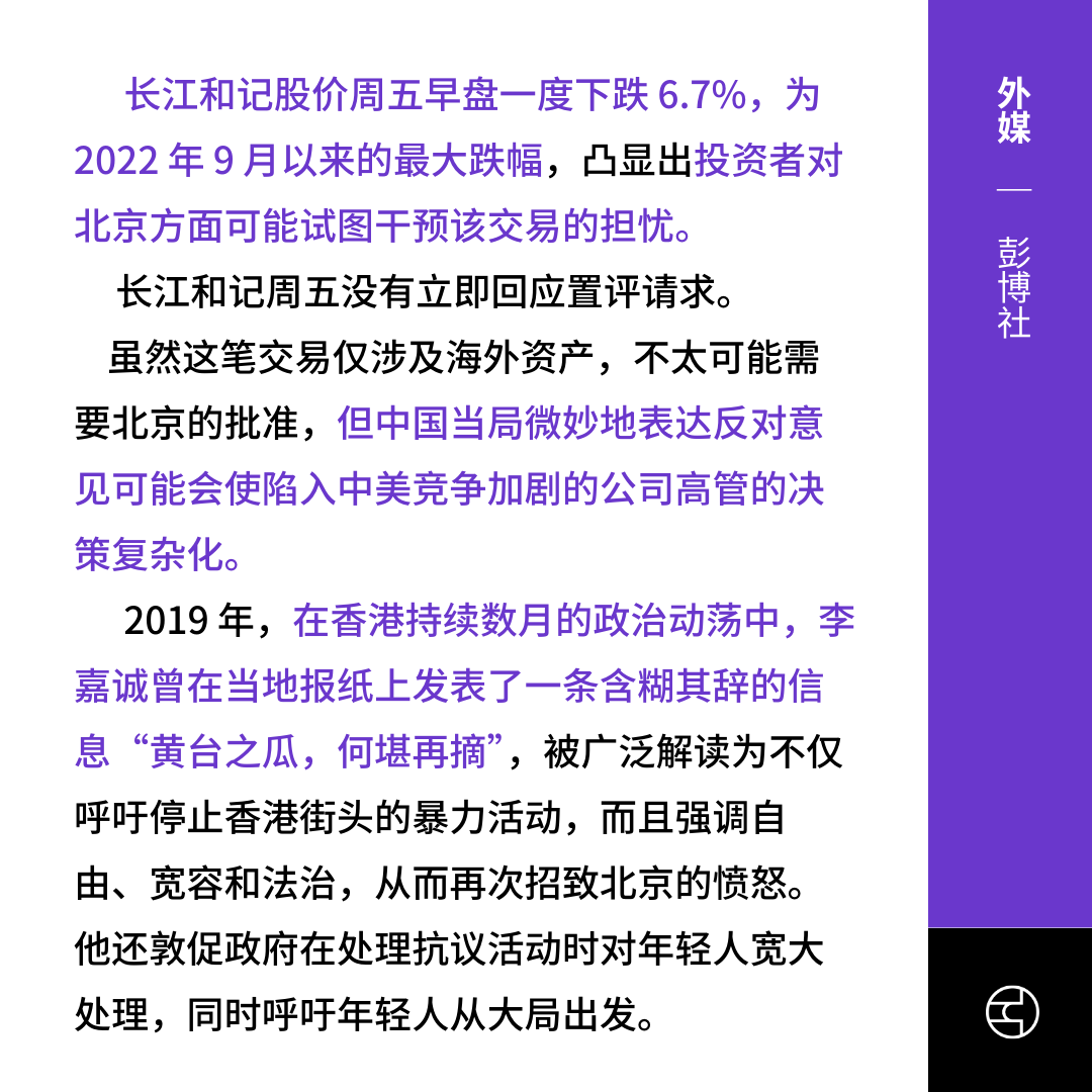 《彭博社》报道投资者忧虑当局出手影响交易,长江和记股价周五早盘一度下跌 6.7%,为 22 年 9 月以来的最大跌幅。《彭博社》分析,此举使陷入中美竞争加剧的公司高管的决策复杂化。
