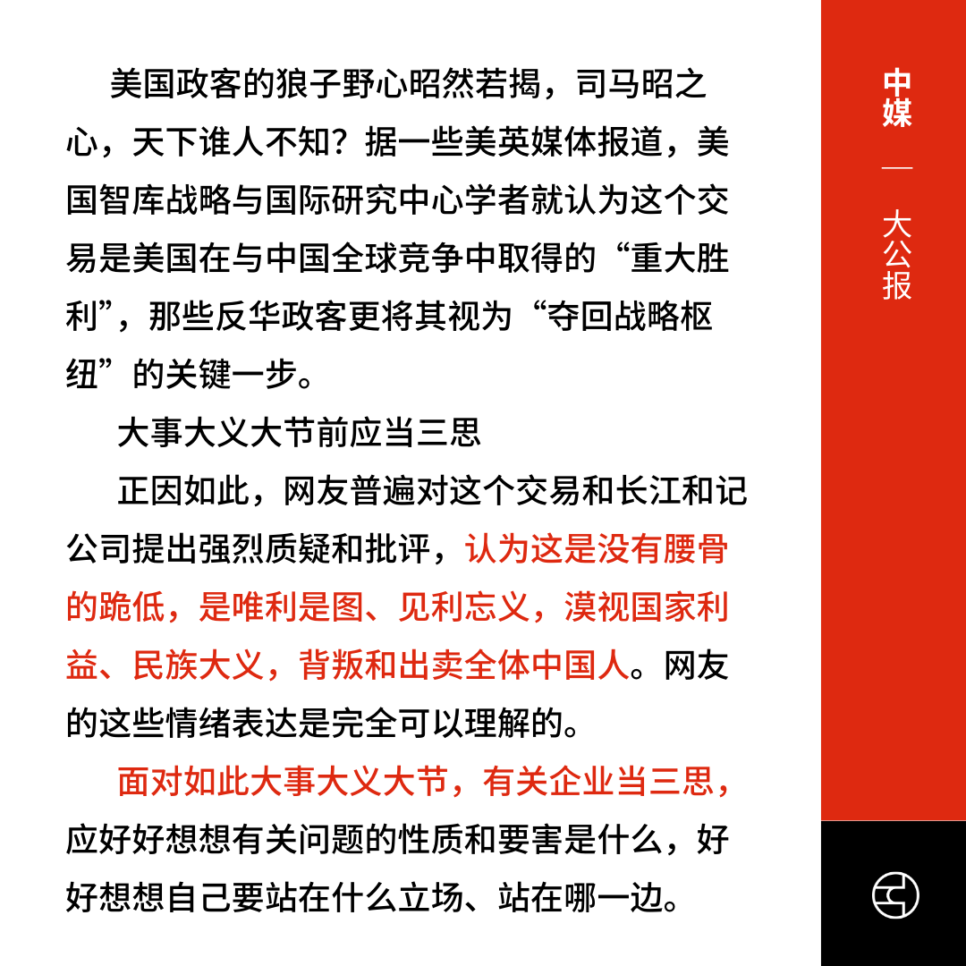 长江和记实业宣布将旗下和记港口集团八成资产出售给美国贝莱德财团,引发中国国务院港澳办罕有地转载香港党媒《大公报》批评,文章担忧美方或借此掌控战略枢纽,冲击“一带一路”和航运贸易安全,并引发舆论质疑李嘉诚唯利是图、漠视民族大义,背叛和出卖全体中国人。