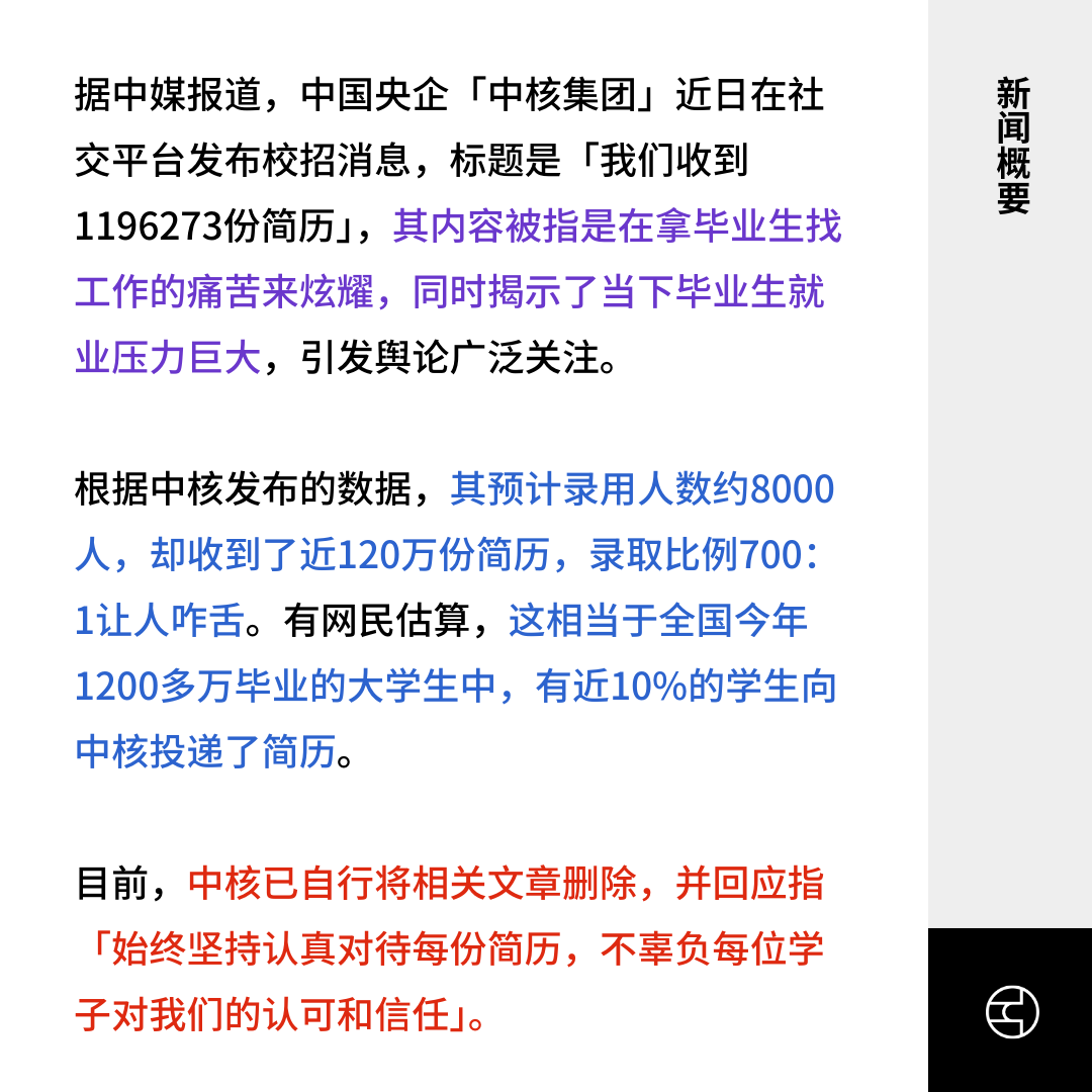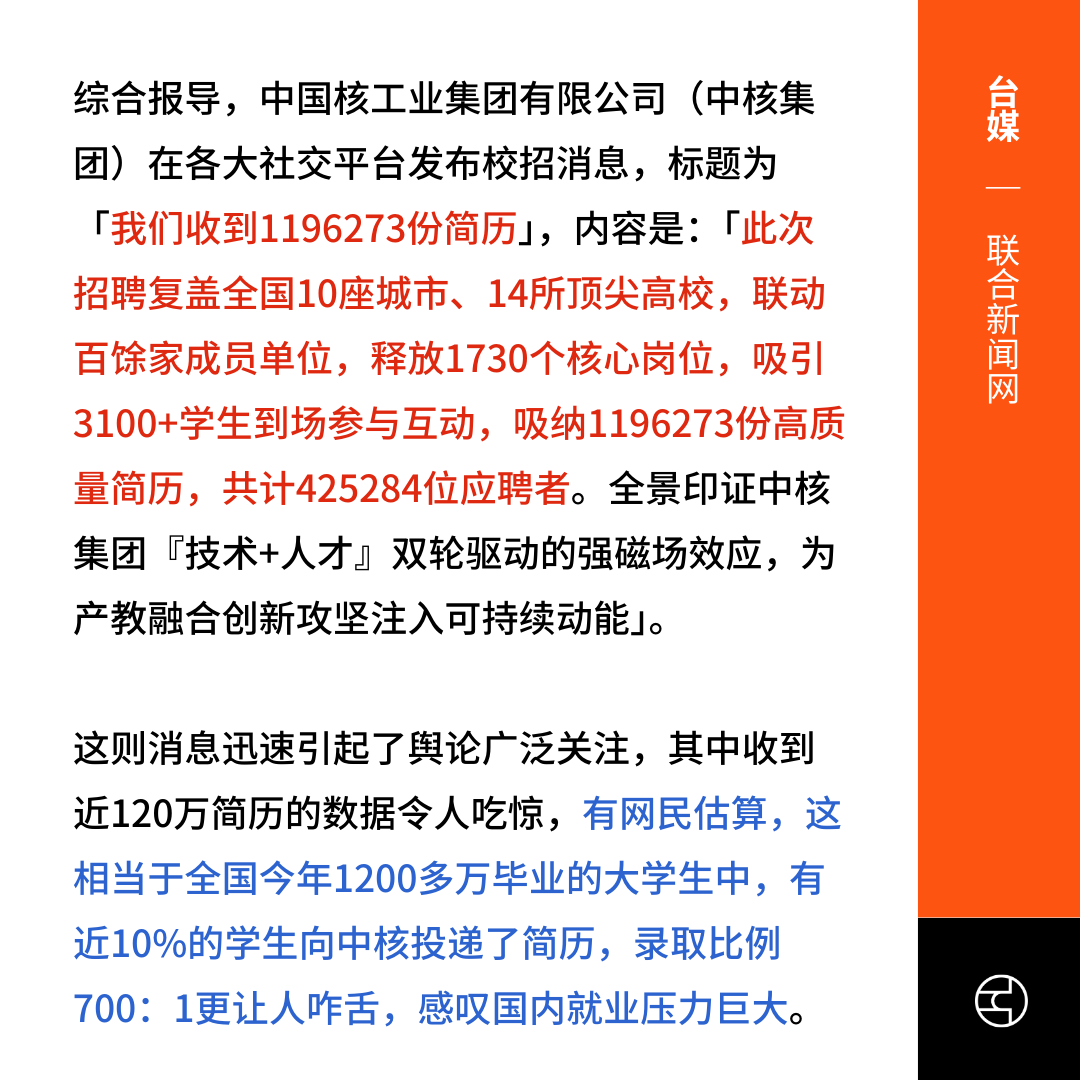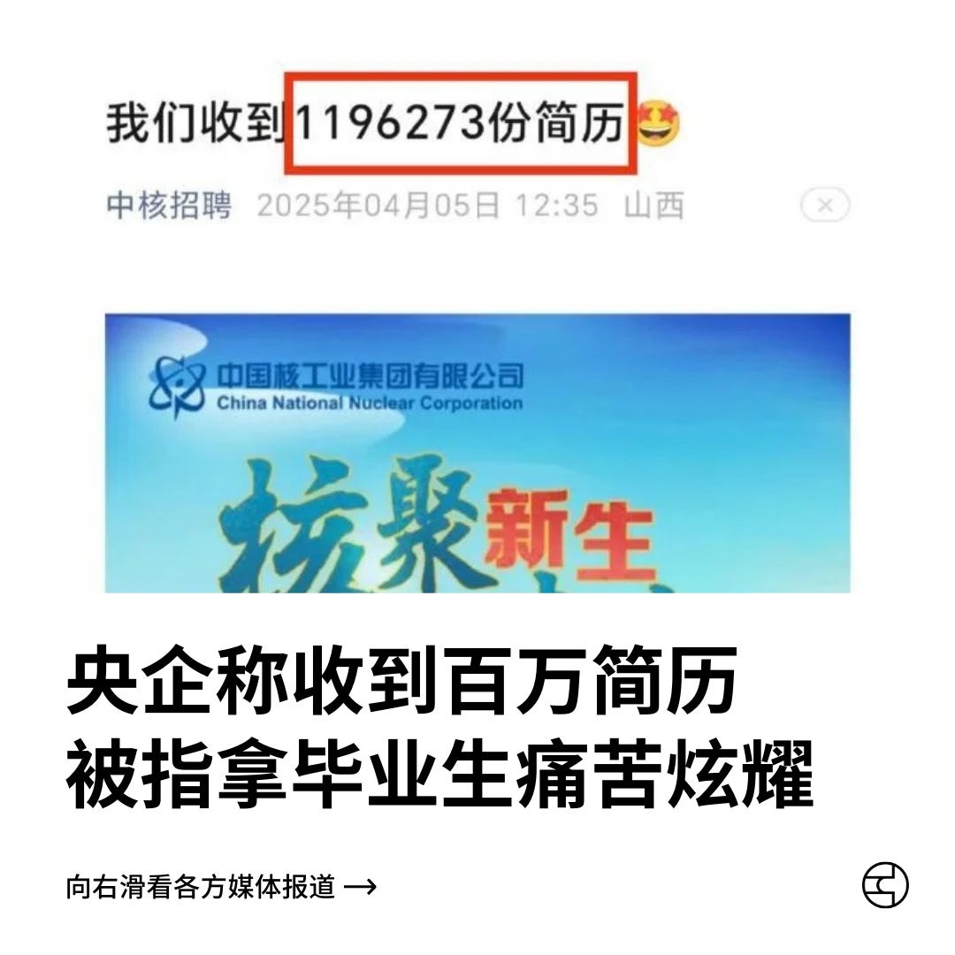 据中媒报道,中国央企「中核集团」近日在社交平台发布校招消息,标题是「我们收到1196273份简历」,其内容被指是在拿毕业生找工作的痛苦来炫耀,同时揭示了当下毕业生就业压力巨大,引发舆论广泛关注。
