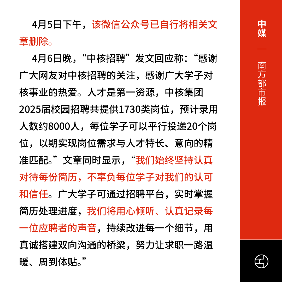 目前,中核已自行将相关文章删除,并回应指「始终坚持认真对待每份简历,不辜负每位学子对我们的认可和信任」。
