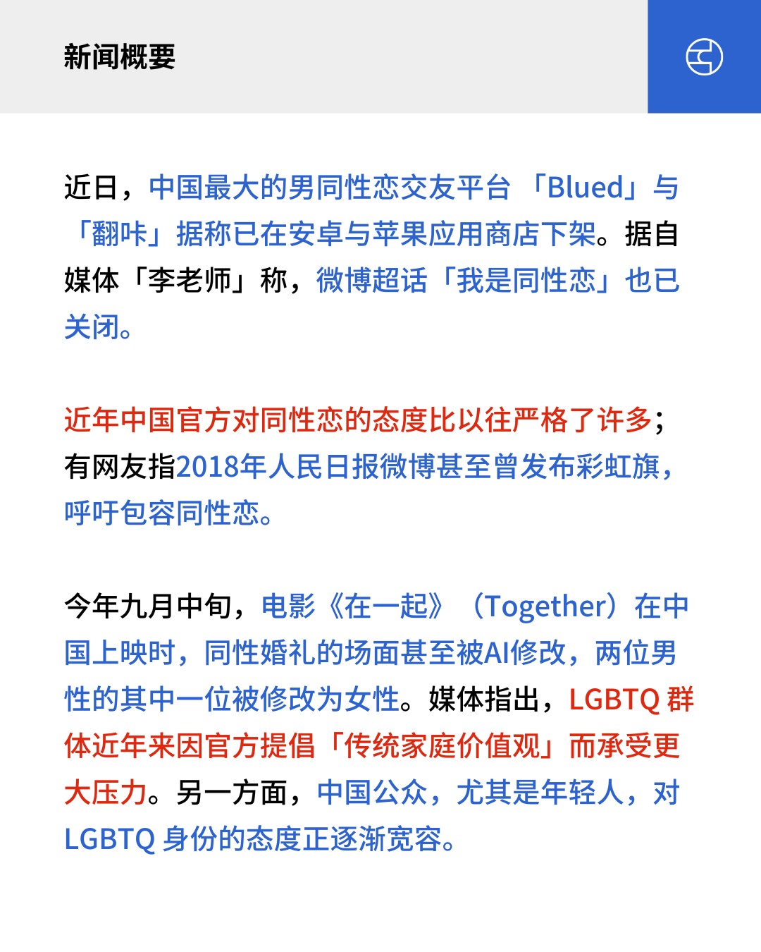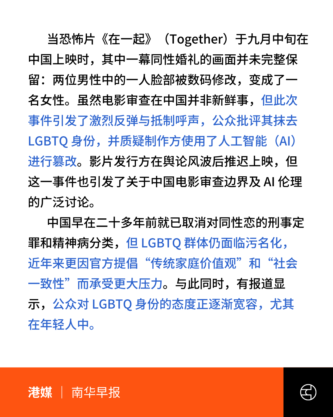今年九月中旬,电影《在一起》(Together)在中国上映时,同性婚礼的场面甚至被AI修改,两位男性的其中一位被修改为女性。媒体指出,LGBTQ 群体近年来因官方提倡「传统家庭价值观」而承受更大压力。另一方面,中国公众,尤其是年轻人,对 LGBTQ 身份的态度正逐渐宽容。