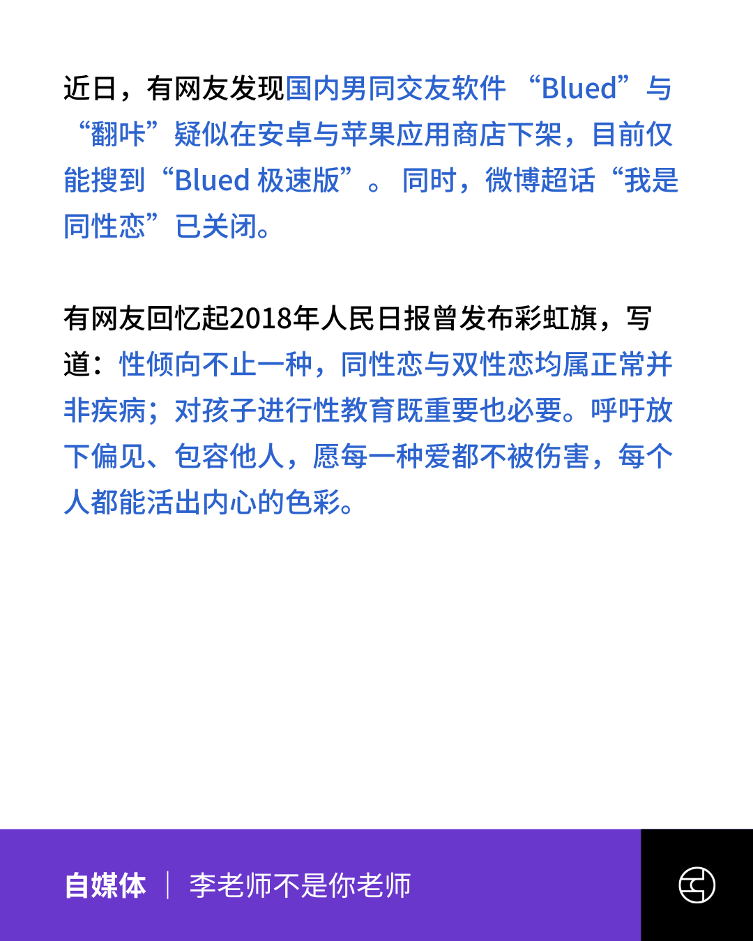 近日,中国最大的男同性恋交友平台 「Blued」与「翻咔」据称已在安卓与苹果应用商店下架。据自媒体「李老师」称,微博超话「我是同性恋」也已关闭。