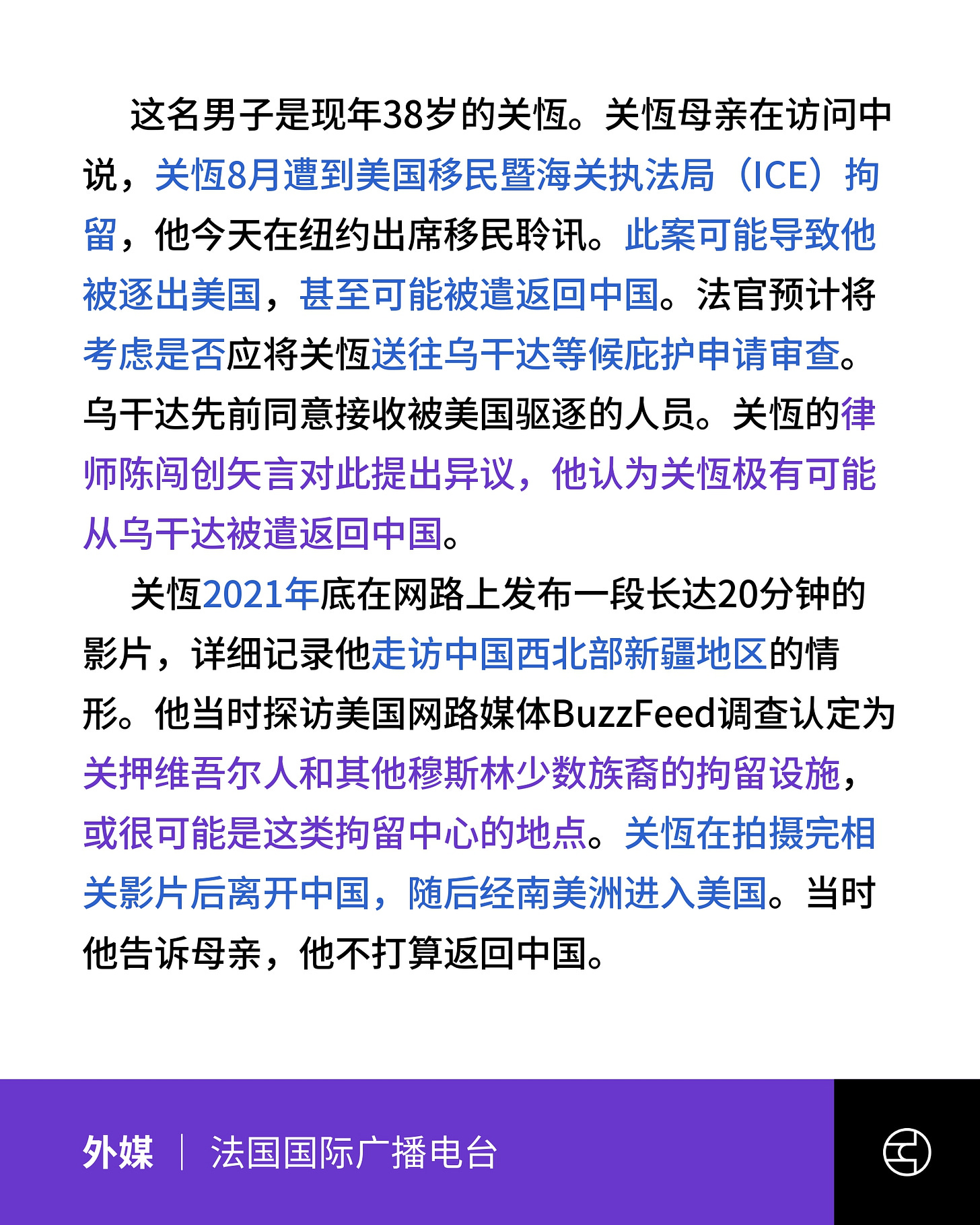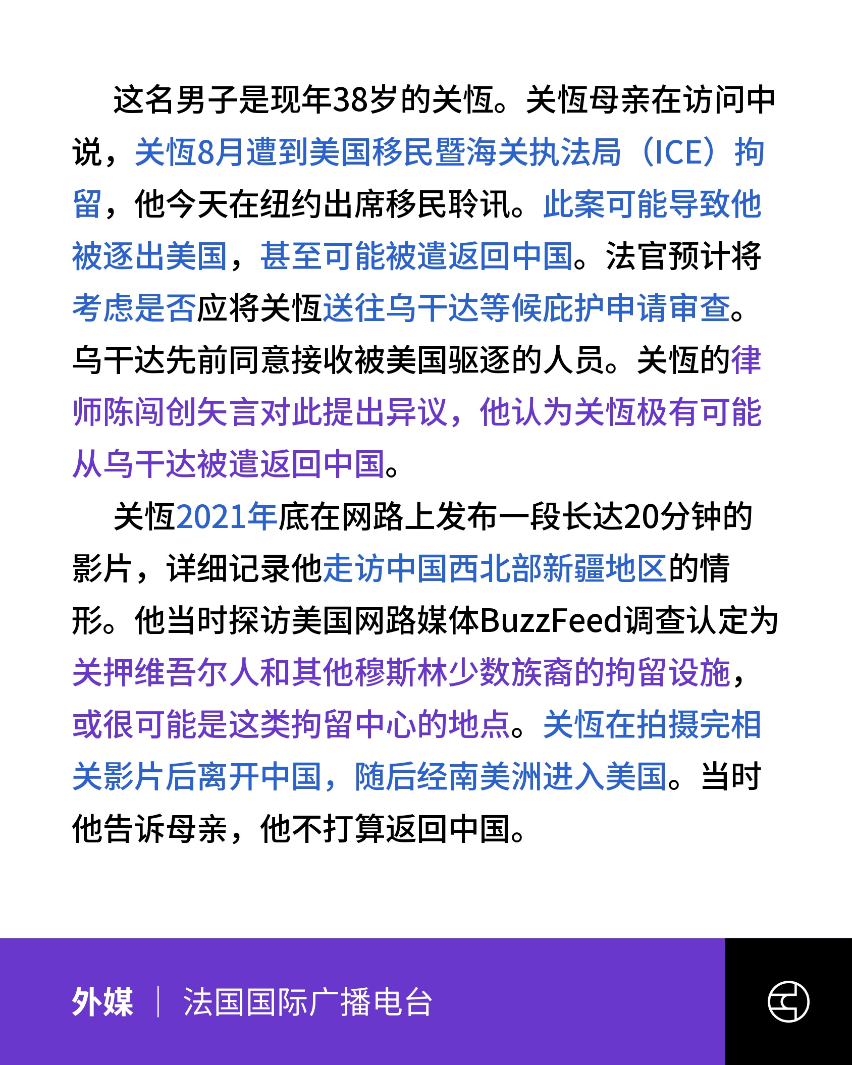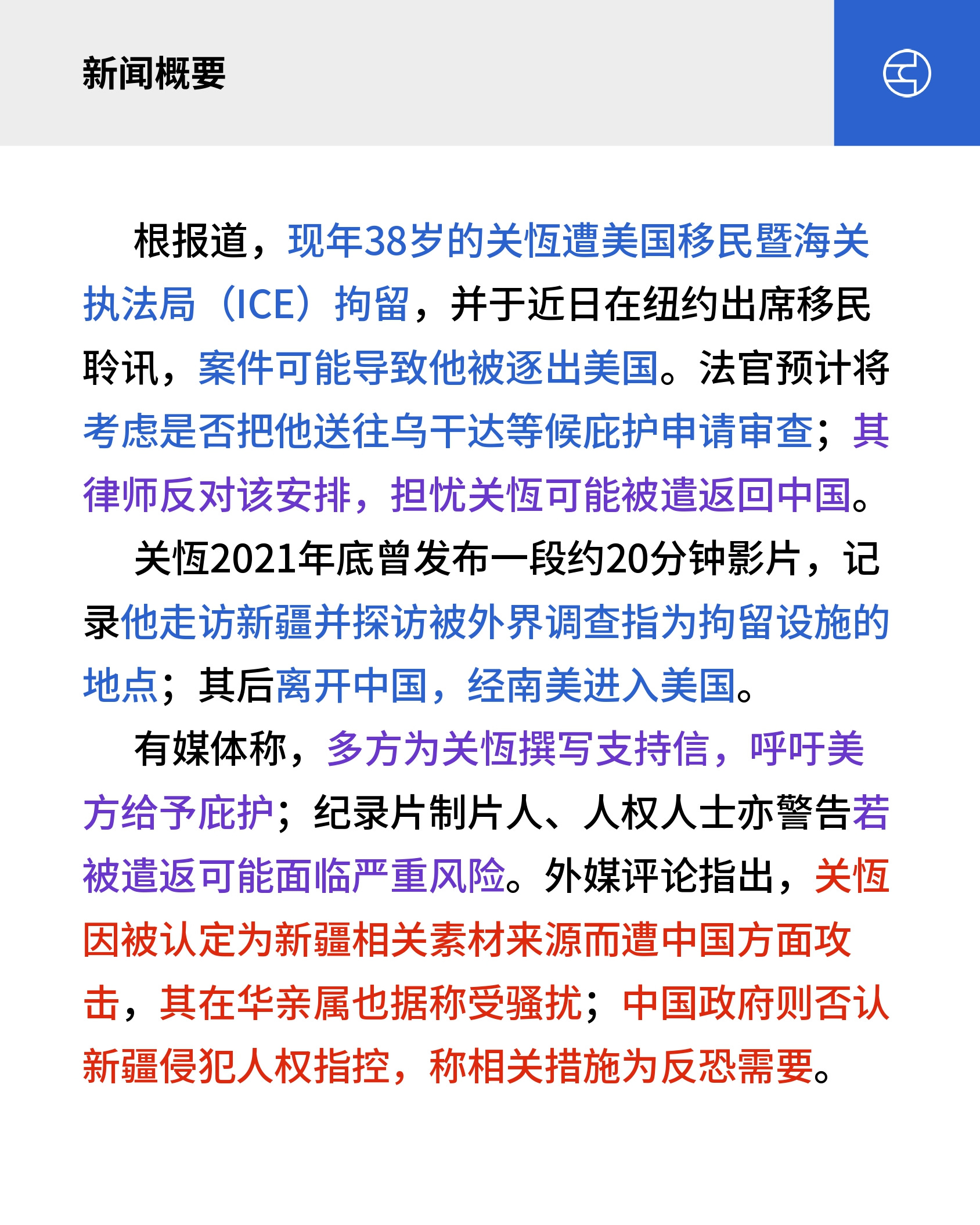 根据报道,现年38岁的关恆遭美国移民暨海关执法局(ICE)拘留,并于近日在纽约出席移民聆讯,案件可能导致他被逐出美国。法官预计将考虑是否把他送往乌干达等候庇护申请审查;其律师反对该安排,担忧关恆可能被遣返回中国。