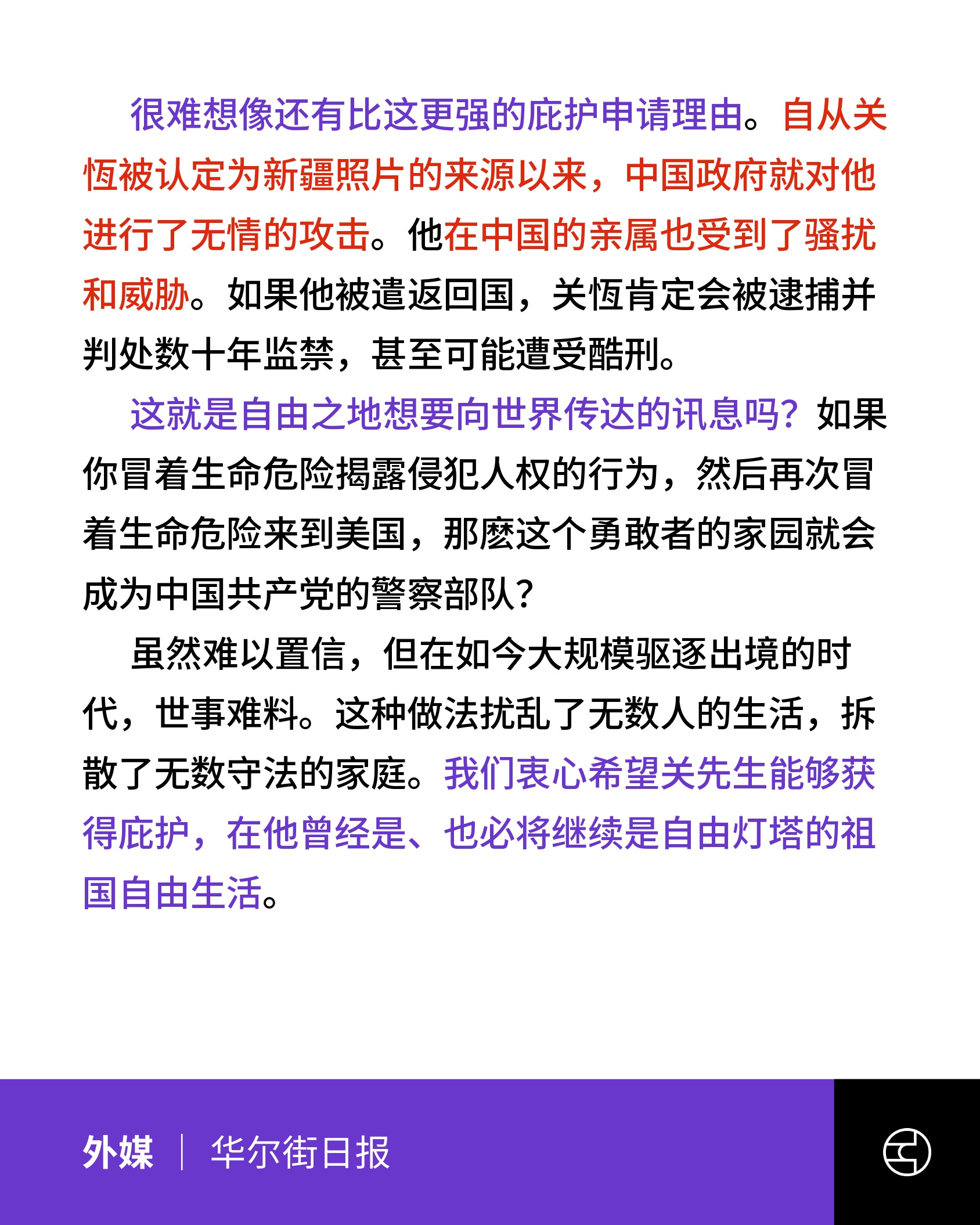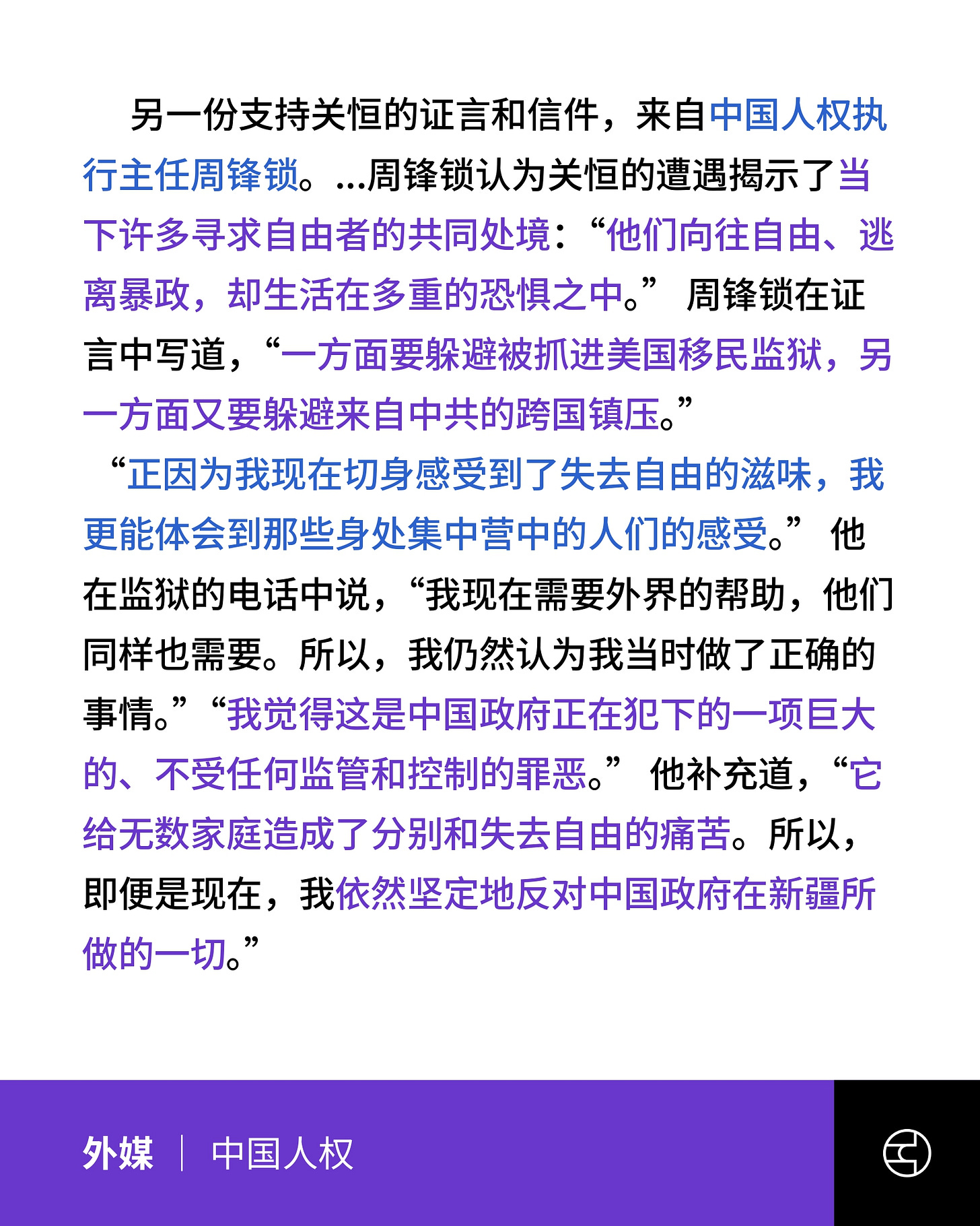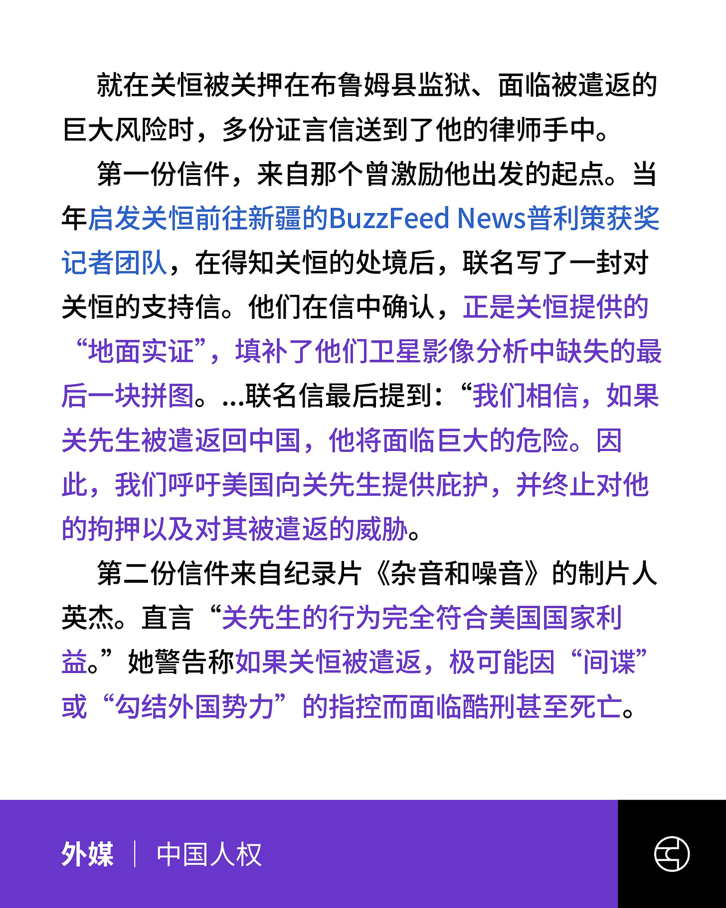 有媒体称,多方为关恆撰写支持信,呼吁美方给予庇护;纪录片制片人、人权人士亦警告若被遣返可能面临严重风险。外媒评论指出,关恆因被认定为新疆相关素材来源而遭中国方面攻击,其在华亲属也据称受骚扰;中国政府则否认新疆侵犯人权指控,称相关措施为反恐需要。