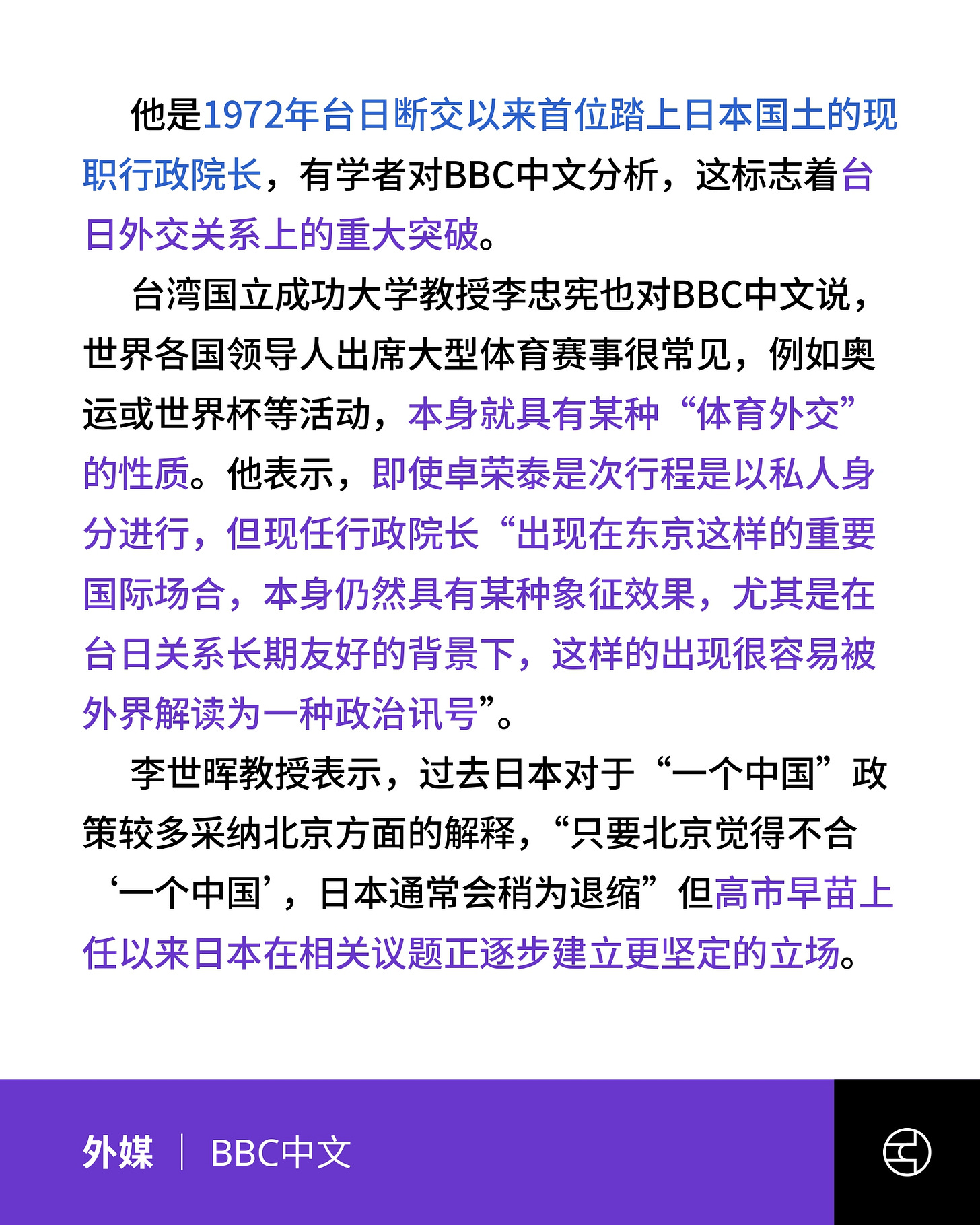 学者向外媒表示,现任行政院长在国际赛事场合公开现身,本身具有象征意义,容易被外界解读为政治讯号;也有观点认为,日本在台湾议题上的立场近年来逐渐趋于明确。民进党相关人士则表示此次行程对于整个台日关系就是突破。