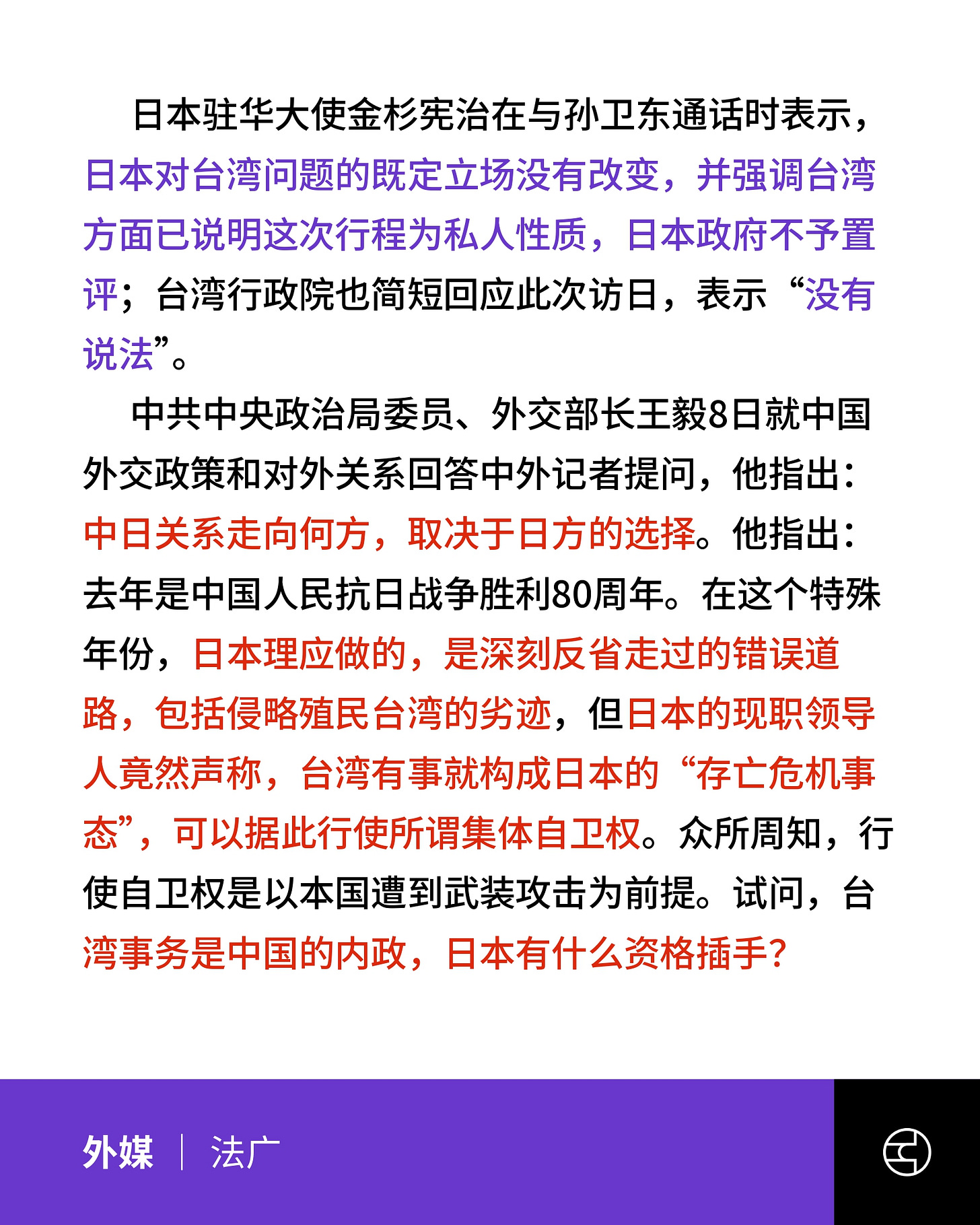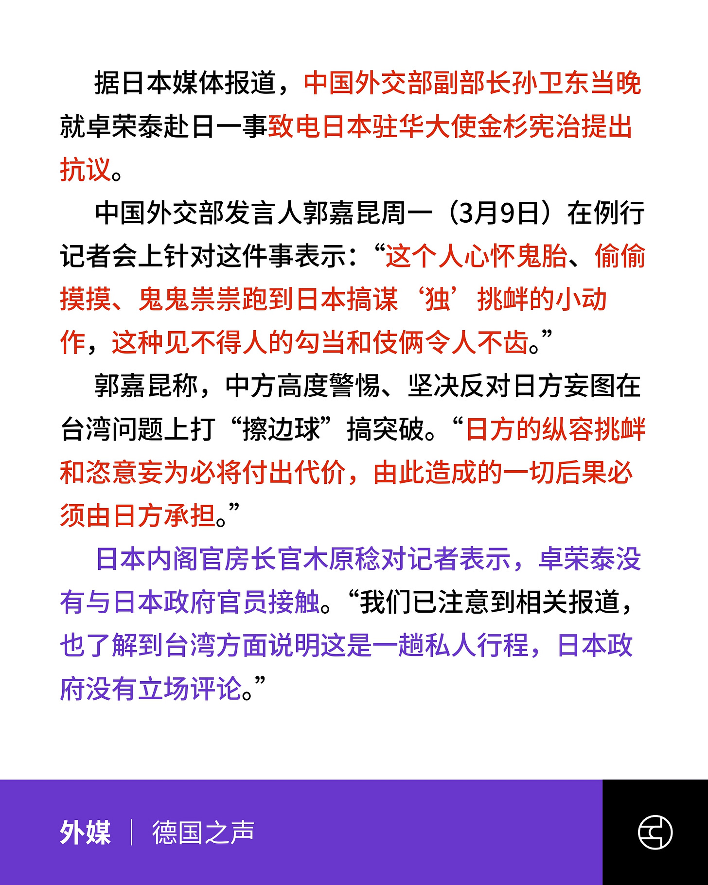 国台办称日本放任台湾官员赴日,违反“一个中国原则”及中日政治文件精神。日本政府则回应称,卓荣泰此行未与日本政府官员接触,日本方面注意到台湾称其为私人行程,因此不予评论。