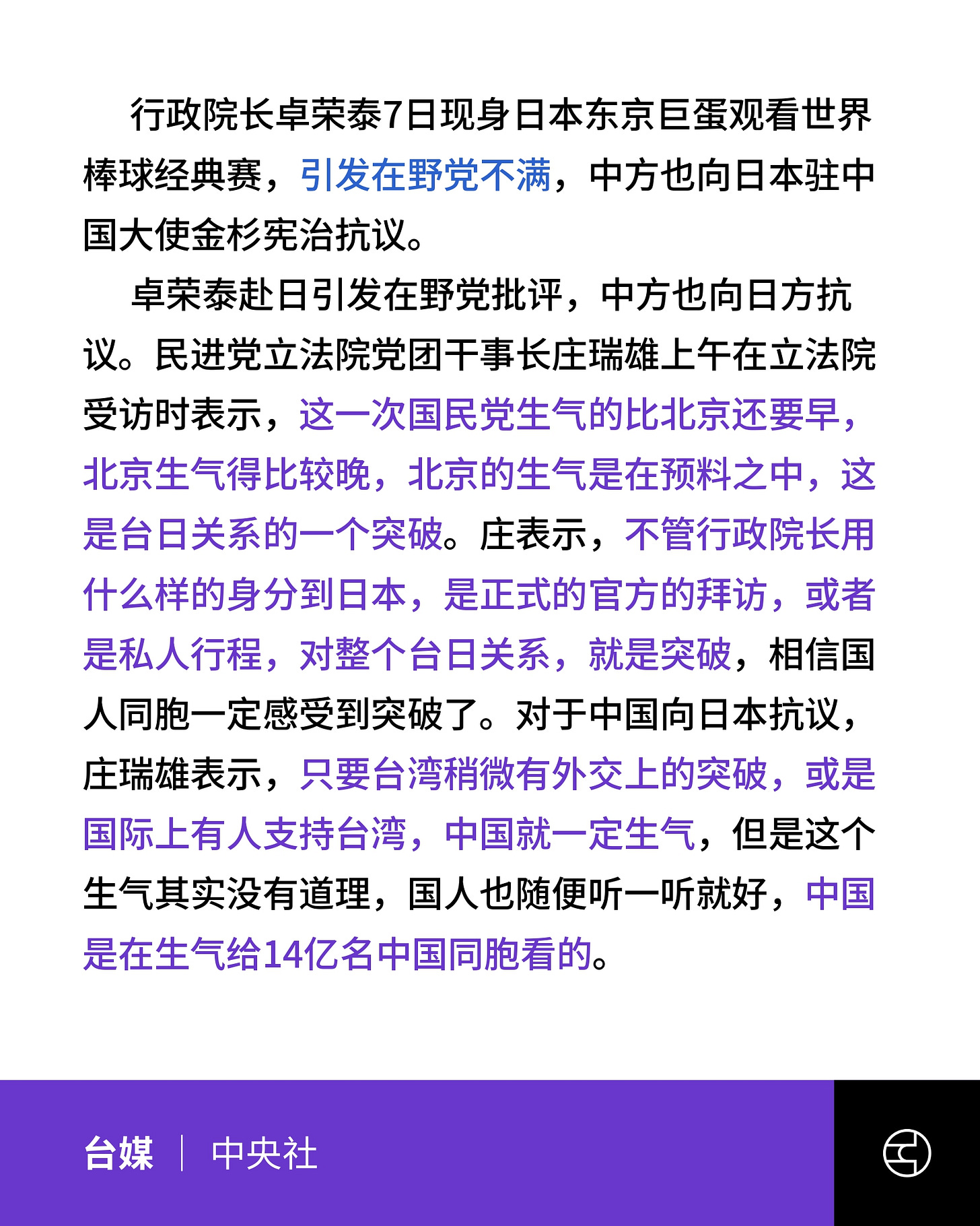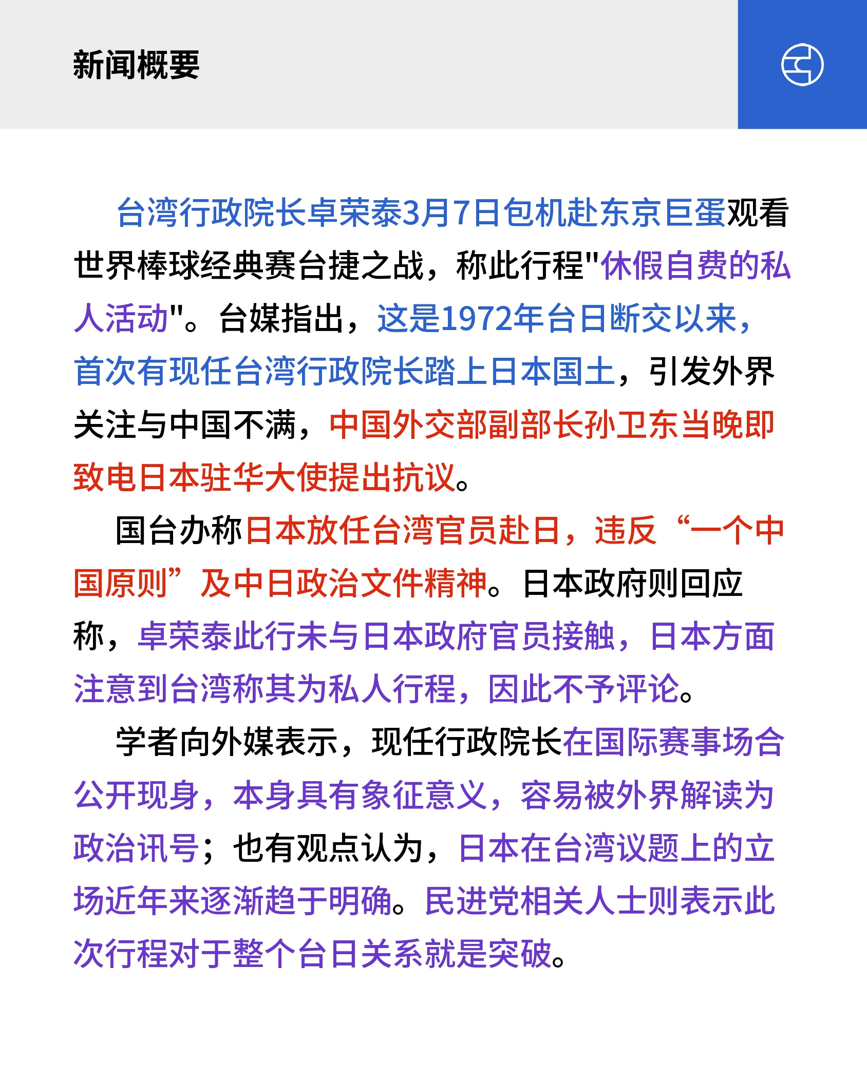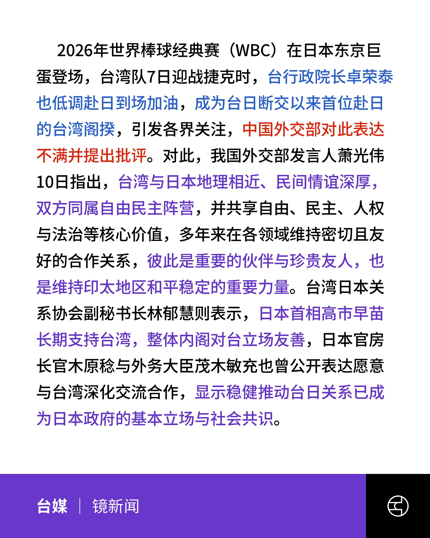 台湾行政院长卓荣泰3月7日包机赴东京巨蛋观看世界棒球经典赛台捷之战,称此行程”休假自费的私人活动”。台媒指出,这是1972年台日断交以来,首次有现任台湾行政院长踏上日本国土,引发外界关注与中国不满,中国外交部副部长孙卫东当晚即致电日本驻华大使提出抗议。