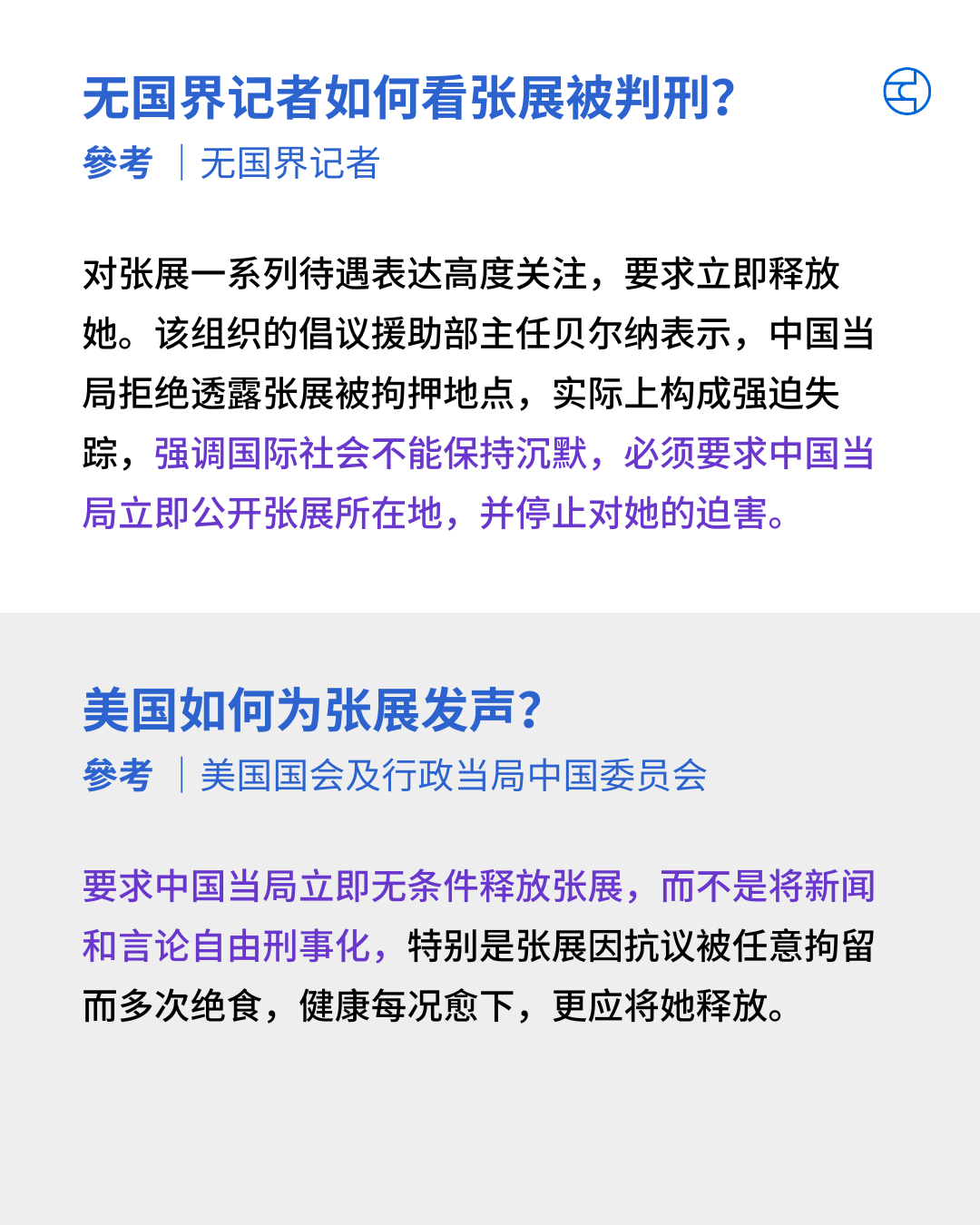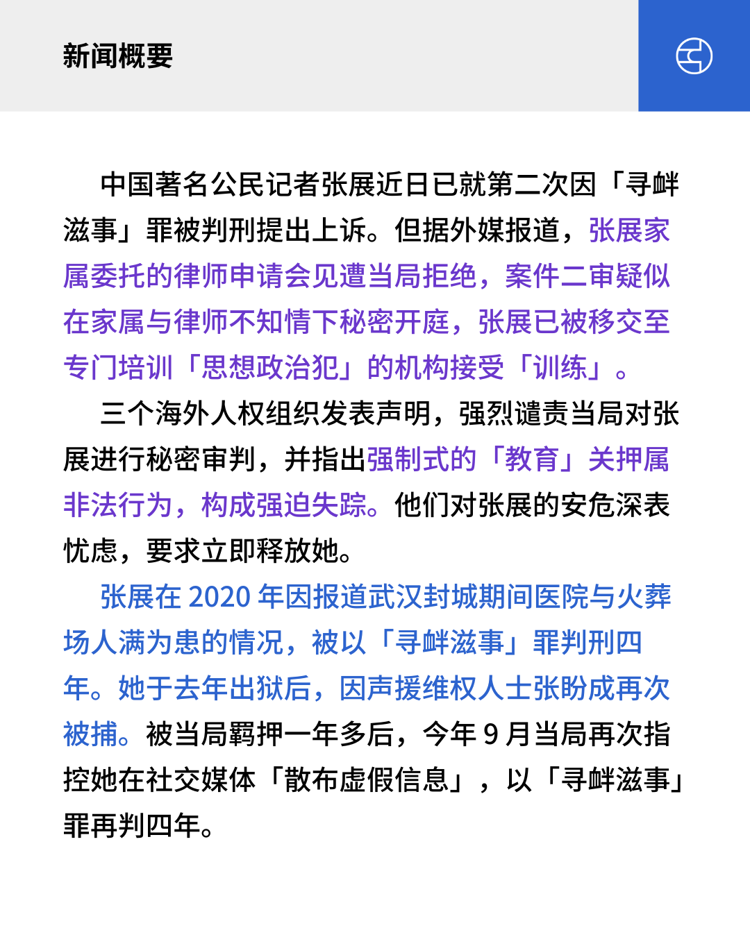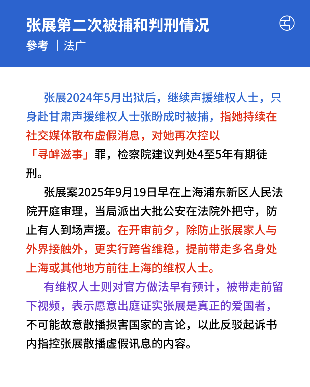 张展在 2020 年因报道武汉封城期间医院与火葬场人满为患的情况,被以「寻衅滋事」罪判刑四年。她于去年出狱后,因声援维权人士张盼成再次被捕。被当局羁押一年多后,今年 9 月当局再次指控她在社交媒体「散布虚假信息」,以「寻衅滋事」罪再判四年。