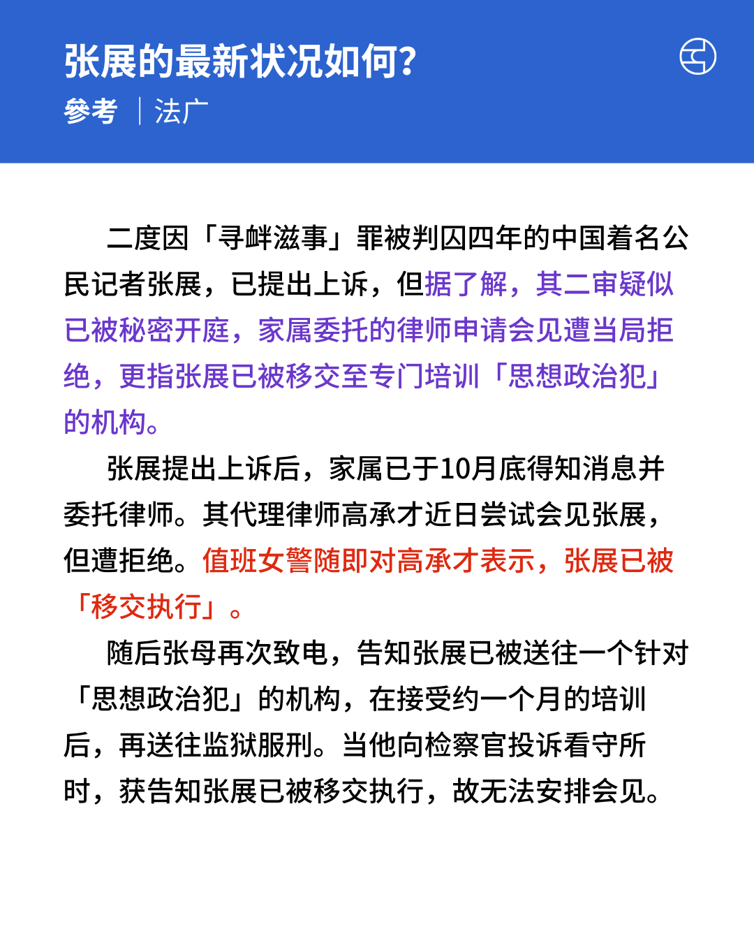 《法广》公民记者张展据称遭移交至针对「思想政治犯」的机构培训律师组织批非法