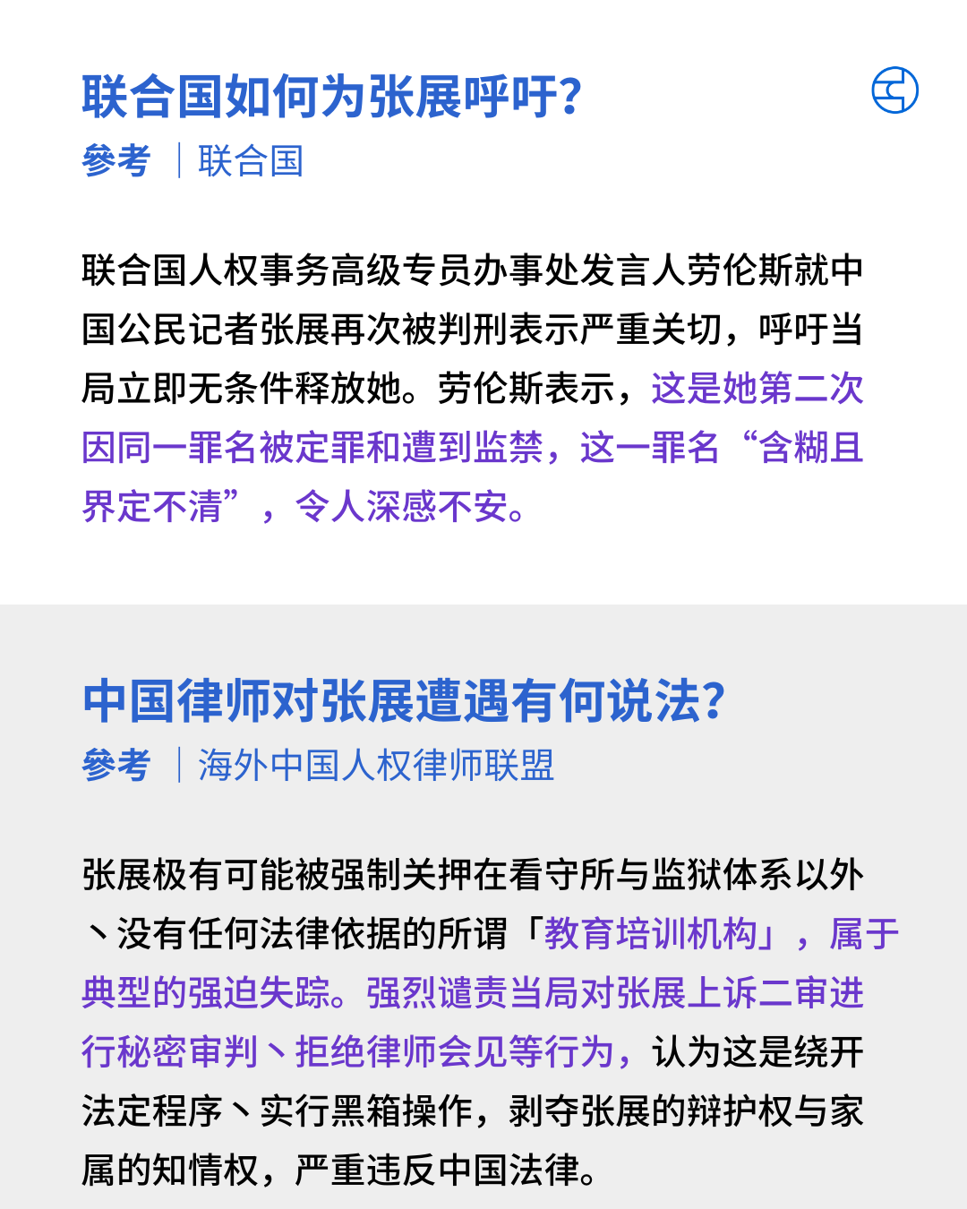 三个海外人权组织就张展被送往「洗脑」机构一事发表声明,强烈谴责当局对张展进行秘密审判,并指出强制式的「教育」关押属非法行为,构成强迫失踪。他们对张展的安危深表忧虑,要求立即释放她。