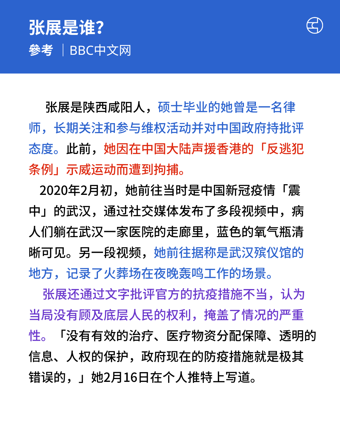 《BBC中文網》张展成首个武汉疫情中遭公开审判的公民记者,因「炒作疫情」被判四年