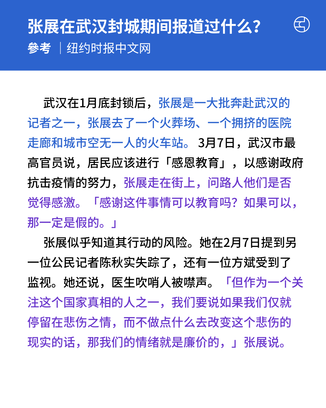 《纽约时报中文网》记录武汉疫情被指「编造谎言」,公民记者张展获刑四年