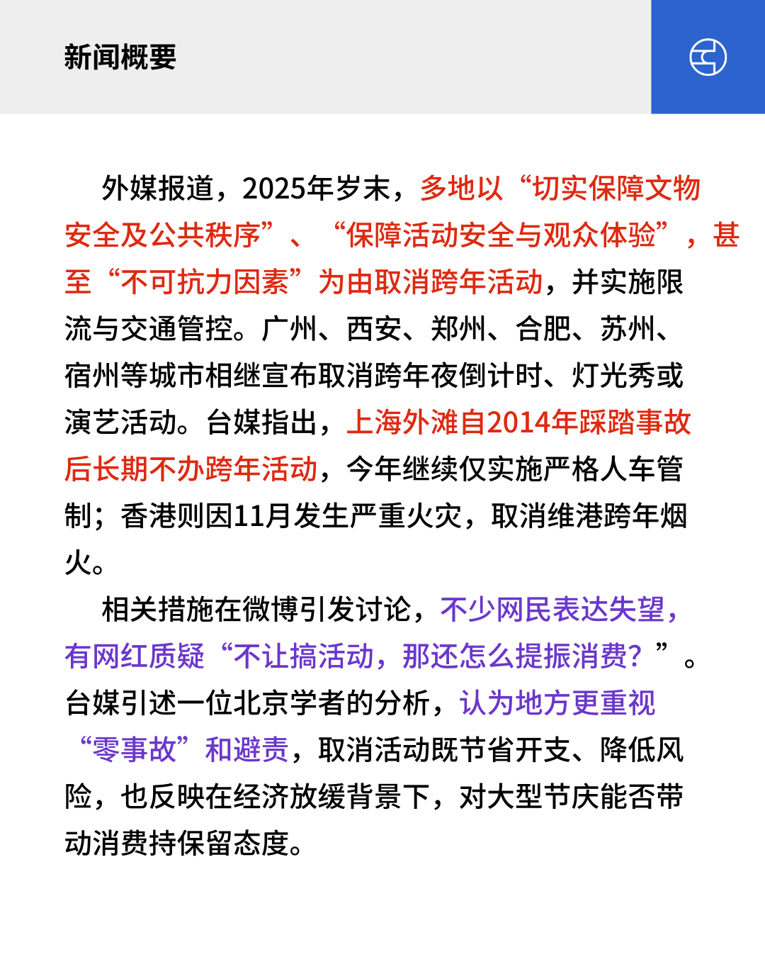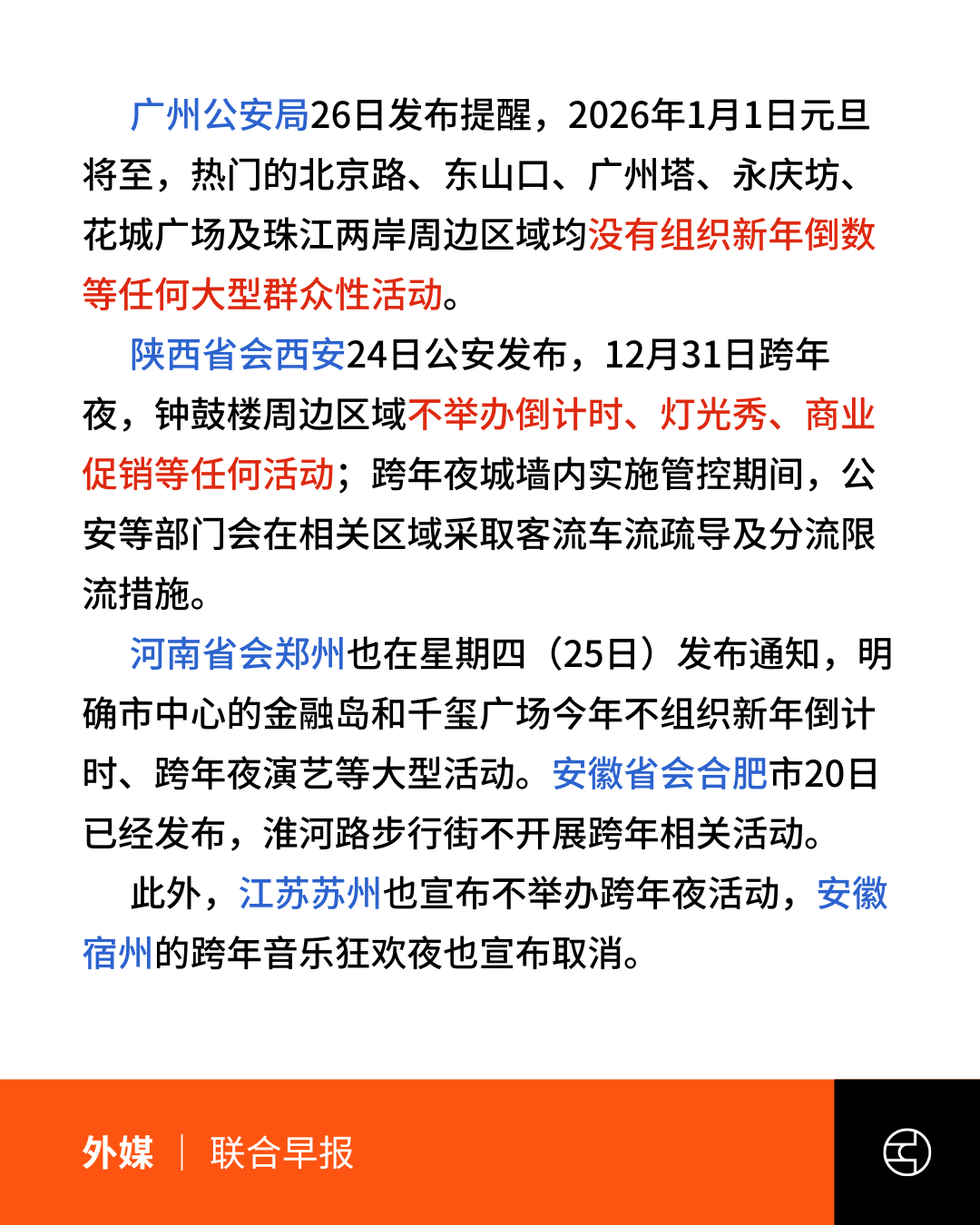 外媒报道,2025年岁末,多地以“切实保障文物安全及公共秩序”、“保障活动安全与观众体验”,甚至“不可抗力因素”为由取消跨年活动,并实施限流与交通管控。广州、西安、郑州、合肥、苏州、宿州等城市相继宣布取消跨年夜倒计时、灯光秀或演艺活动。台媒指出,上海外滩自2014年踩踏事故后长期不办跨年活动,今年继续仅实施严格人车管制;香港则因11月发生严重火灾,取消维港跨年烟火。