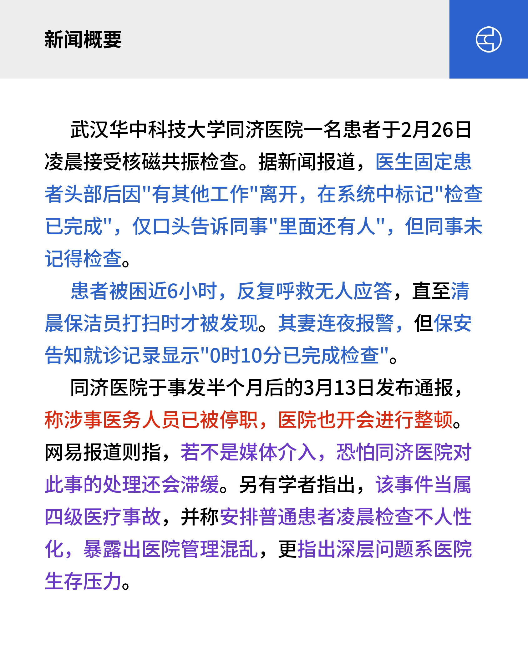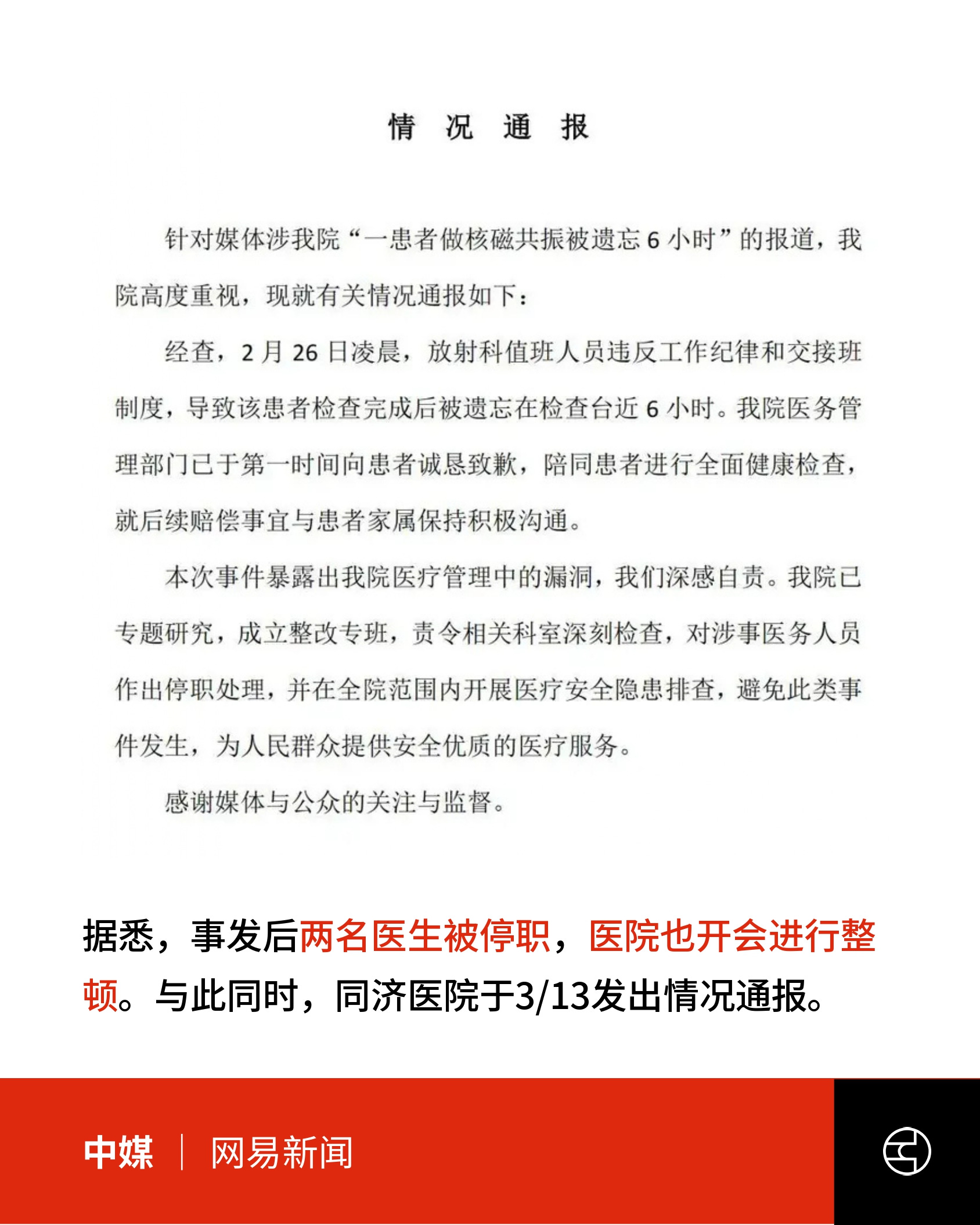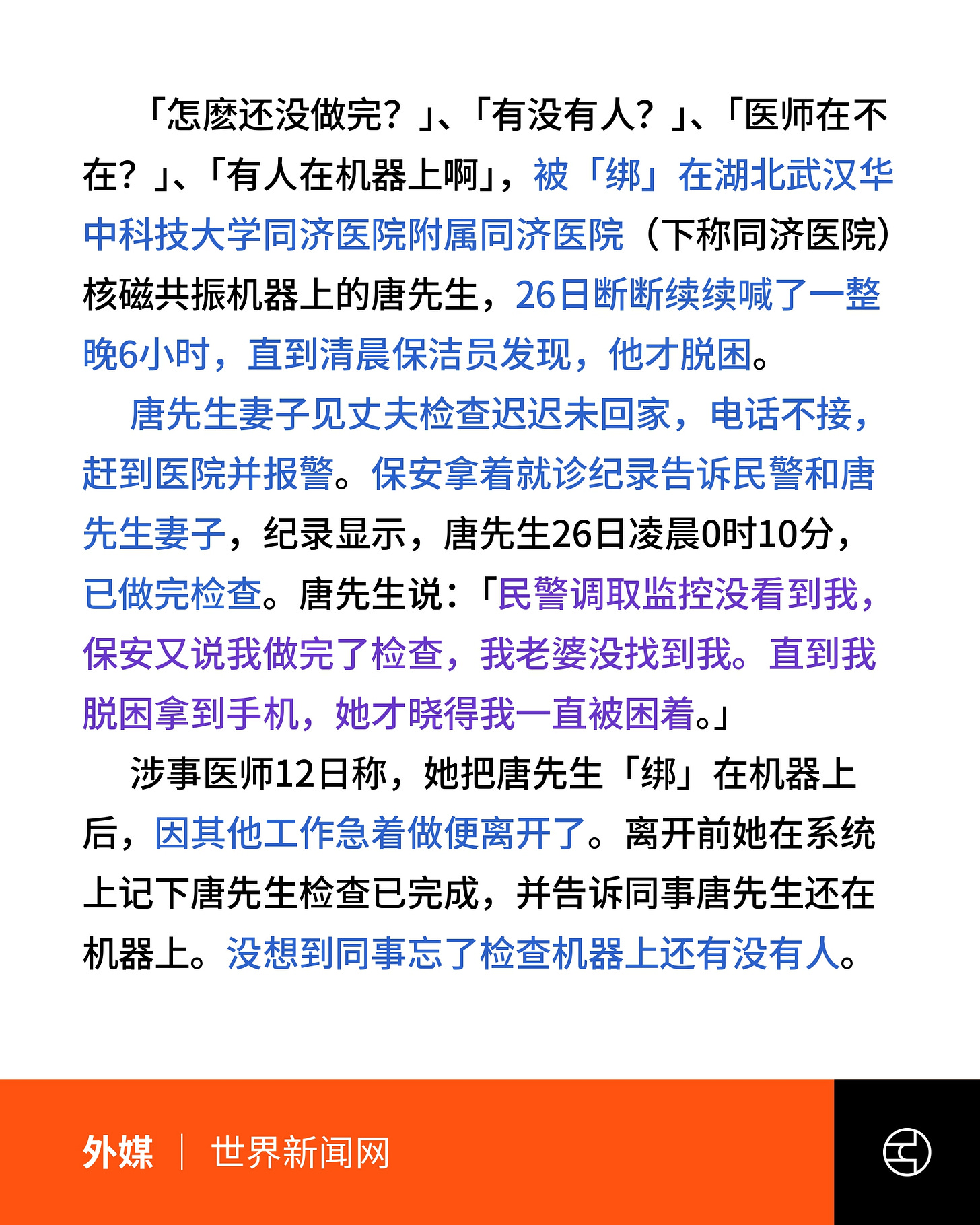 武汉华中科技大学同济医院一名患者于2月26日凌晨接受核磁共振检查。据新闻报道,医生固定患者头部后因”有其他工作”离开,在系统中标记”检查已完成”,仅口头告诉同事”里面还有人”,但同事未记得检查。