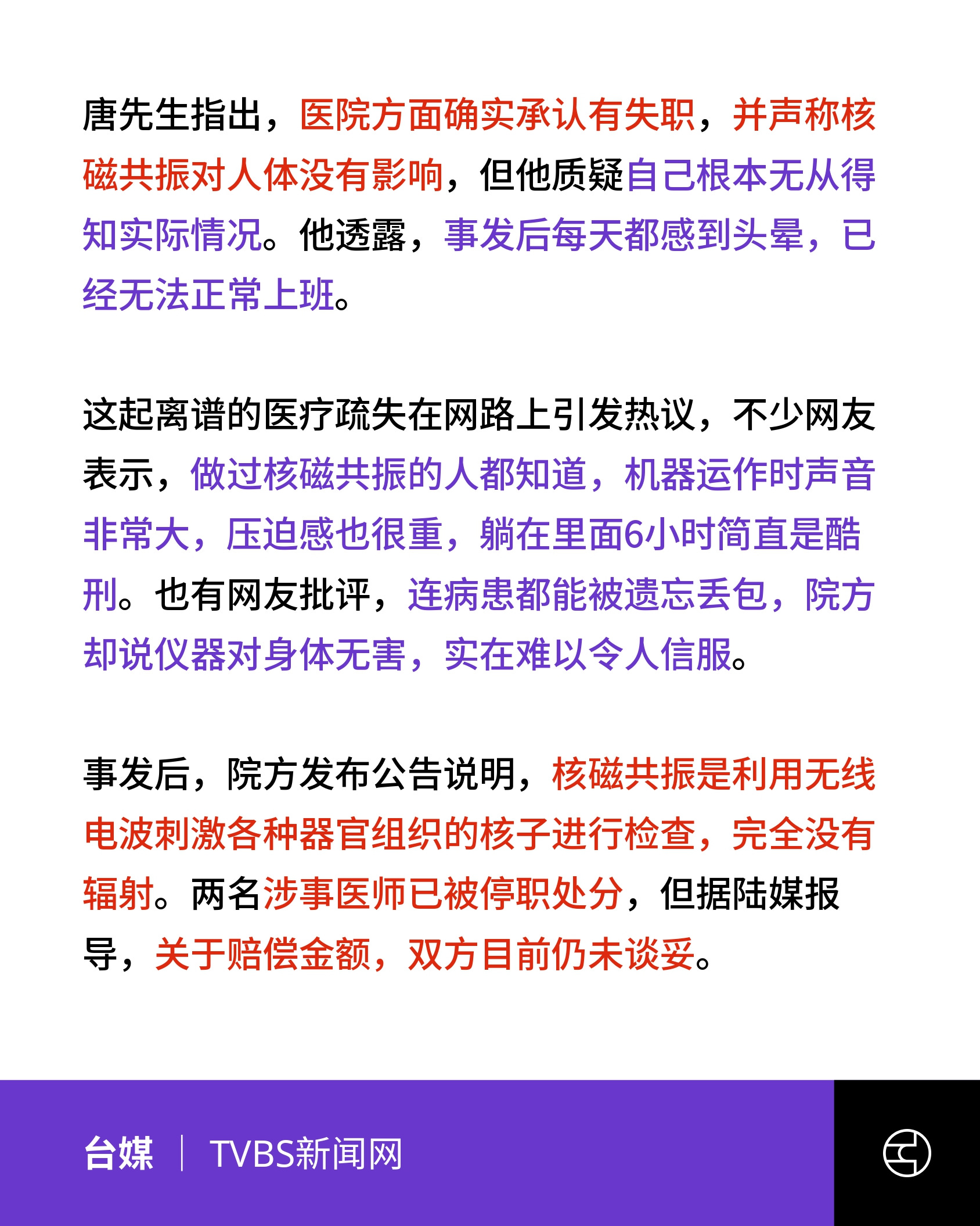 《TVBS新闻网》喊到没力! 武汉男病患被绑MRI机上「过夜」 天天头晕难上班