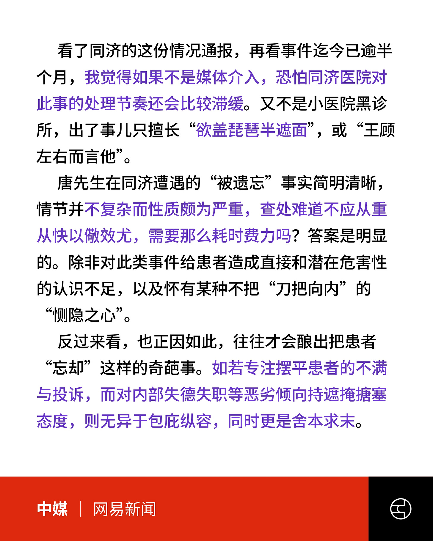 同济医院于事发半个月后的3月13日发布通报,称涉事医务人员已被停职,医院也开会进行整顿。网易报道则指,若不是媒体介入,恐怕同济医院对此事的处理还会滞缓。另有学者指出,该事件当属四级医疗事故,并称安排普通患者凌晨检查不人性化,暴露出医院管理混乱,更指出深层问题系医院生存压力。