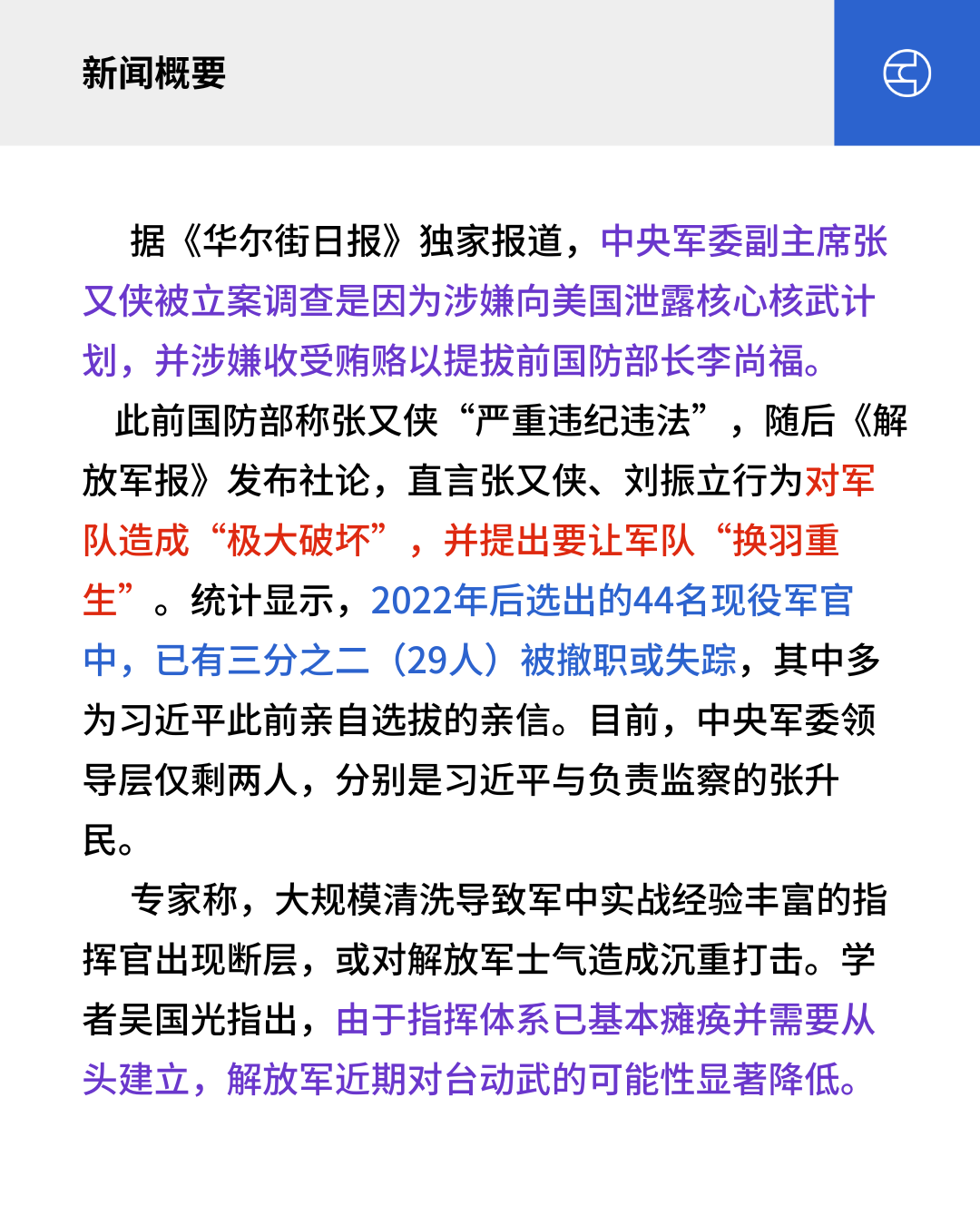 此前国防部称张又侠“严重违纪违法”,随后《解放军报》发布社论,直言张又侠、刘振立行为对军队造成“极大破坏”,并提出要让军队“换羽重生”。统计显示,2022年后选出的44名现役军官中,已有三分之二(29人)被撤职或失踪,其中多为习近平此前亲自选拔的亲信。目前,中央军委领导层仅剩两人,分别是习近平与负责监察的张升民。