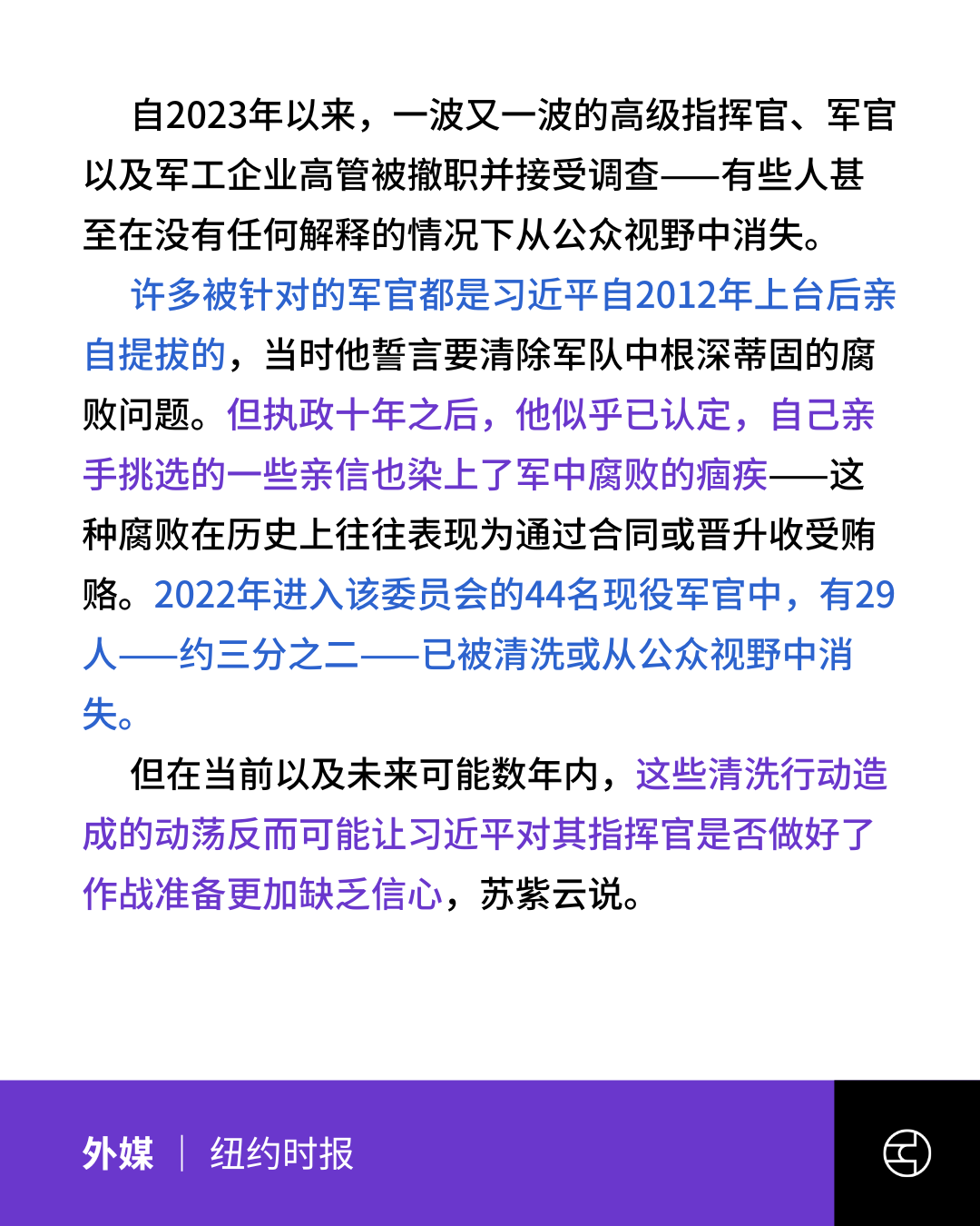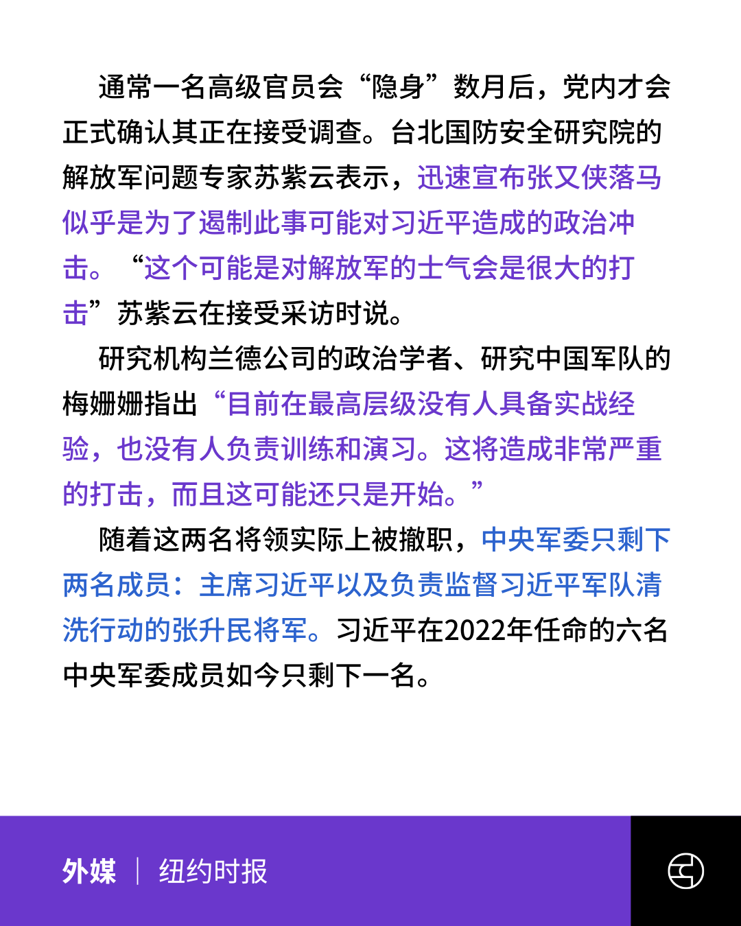 《纽约时报》张又侠落马,习近平清洗解放军高层行动再升级