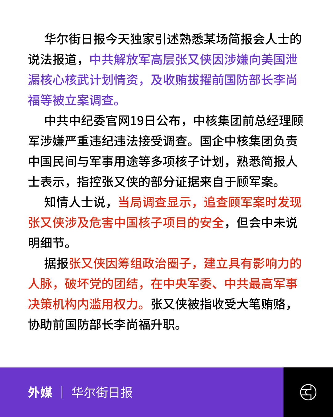 据《华尔街日报》独家报道,中央军委副主席张又侠被立案调查是因为涉嫌向美国泄露核心核武计划,并涉嫌收受贿赂以提拔前国防部长李尚福。