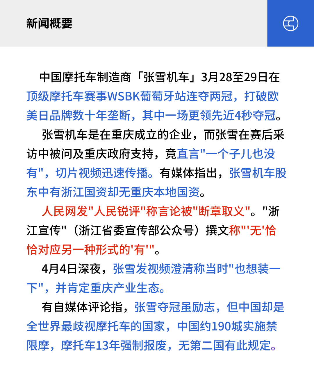 张雪机车是在重庆成立的企业,而张雪在赛后采访中被问及重庆政府支持,竟直言”一个子儿也没有”,切片视频迅速传播。有媒体指出,张雪机车股东中有浙江国资却无重庆本地国资。