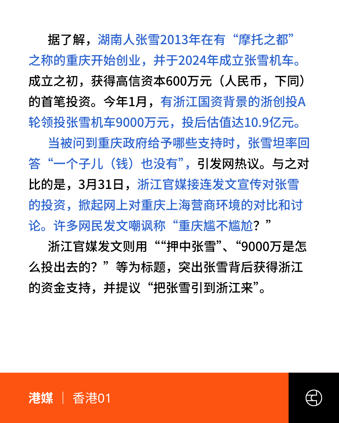 《香港01》张雪机车夺冠|创办人张雪称重庆政府“一个子儿都没出”引热议