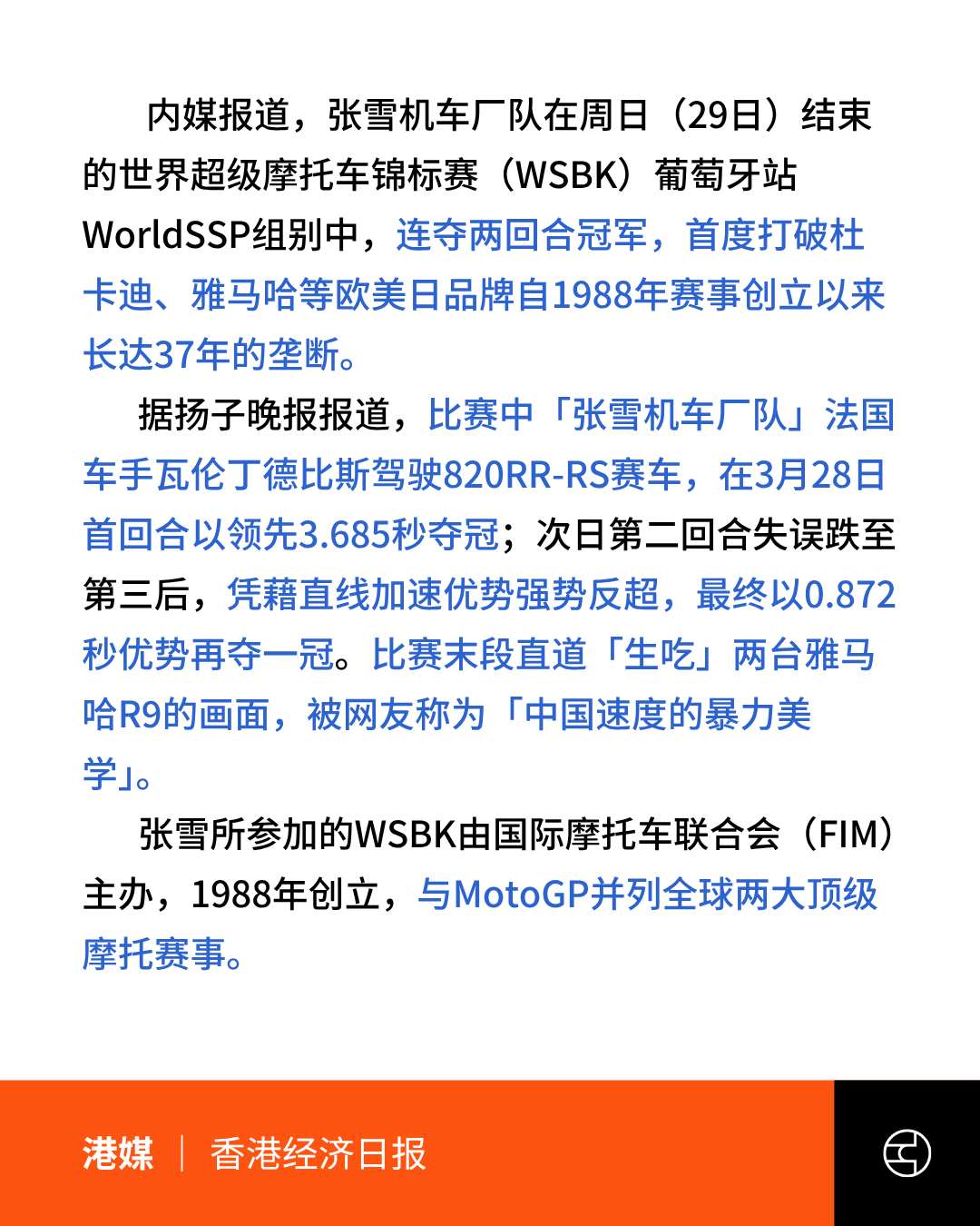 《香港经济日报》中國「張雪機車」WSBK連奪兩冠 打破歐美日37年壟斷