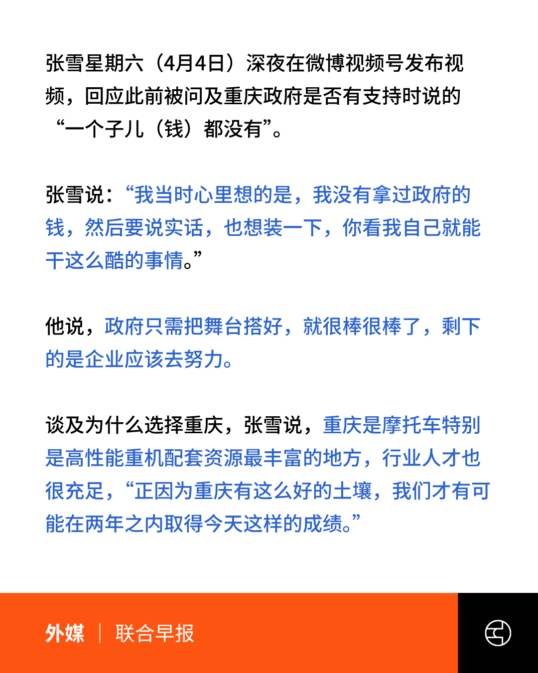 4月4日深夜,张雪发视频澄清称当时”也想装一下”,并肯定重庆产业生态。