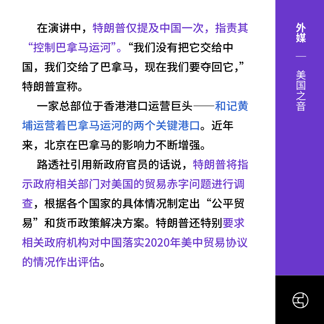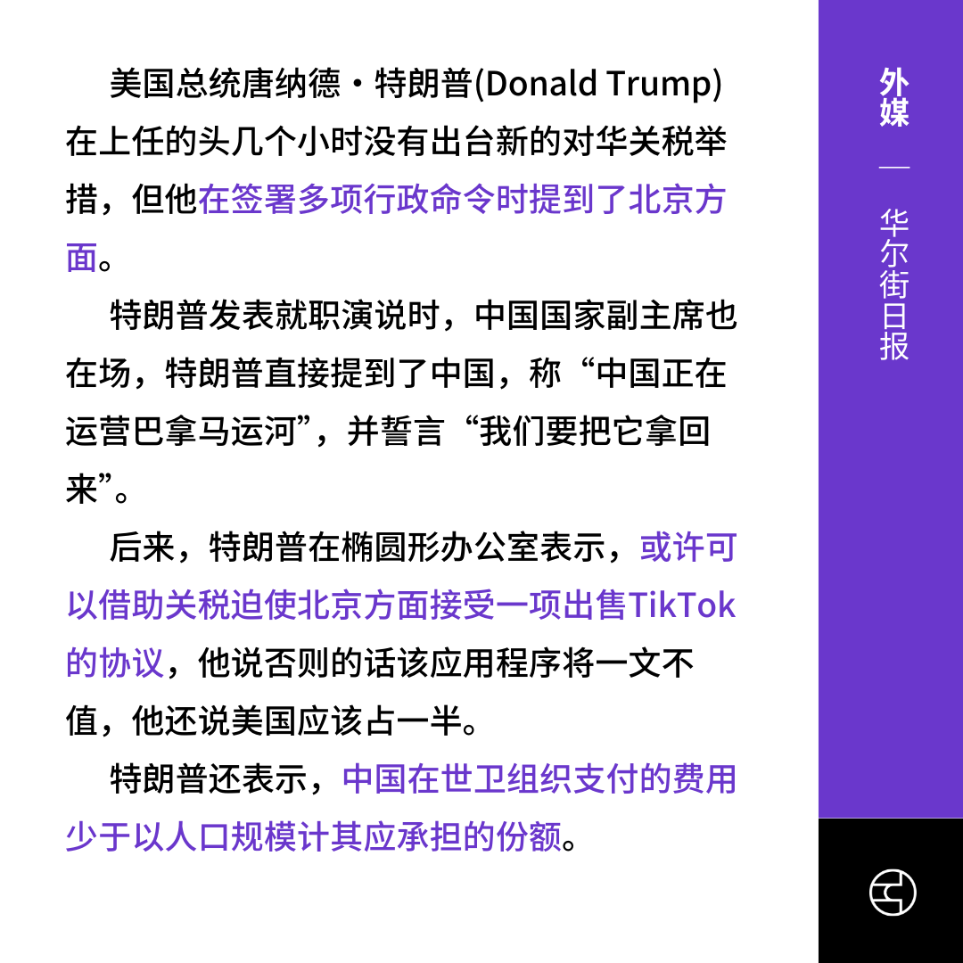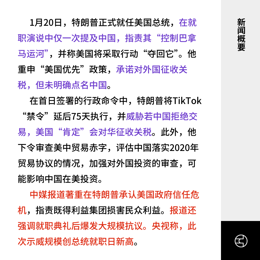 1月20日,特朗普正式就任美国总统,在就职演说中仅一次提及中国,指责其“控制巴拿马运河”,并称美国将采取行动“夺回它”。他重申“美国优先”政策,承诺对外国征收关税,但未明确点名中国。