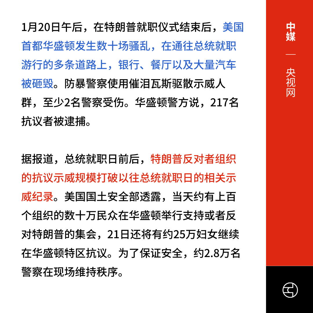 《央视网》特朗普宣誓就任美国总统,华盛顿发生数十场骚乱