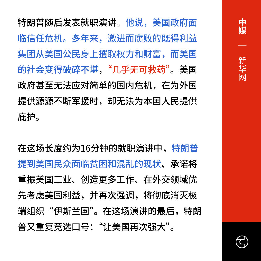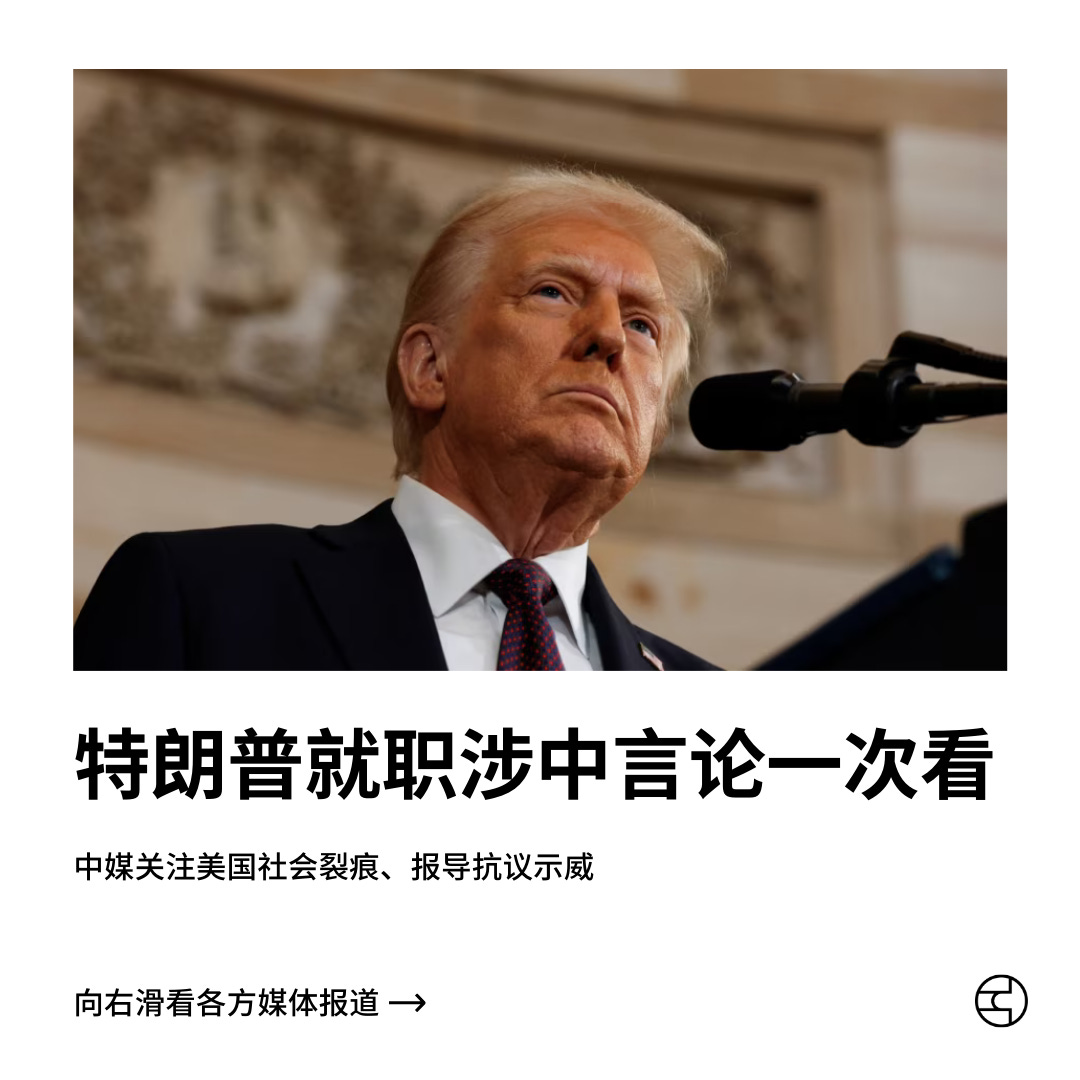 中媒报道著重在特朗普承认美国政府信任危机,指责既得利益集团损害民众利益。报道还强调就职典礼后爆发大规模抗议。央视称,此次示威规模创总统就职日新高。
