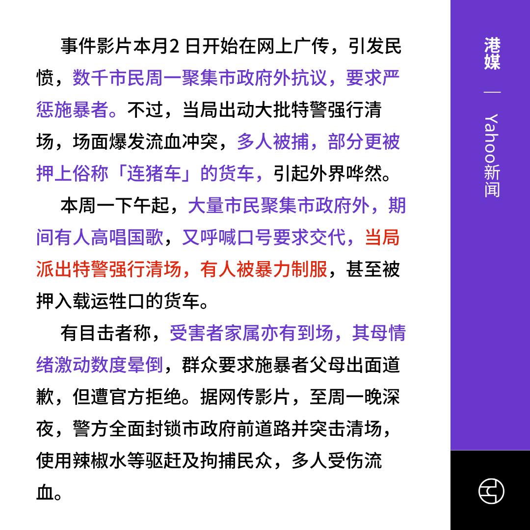 《香港Yahoo新闻》四川江油市14岁女遭欺凌引发千人抗议特警拳打镇压清场「连猪车」抓捕示威者|Yahoo