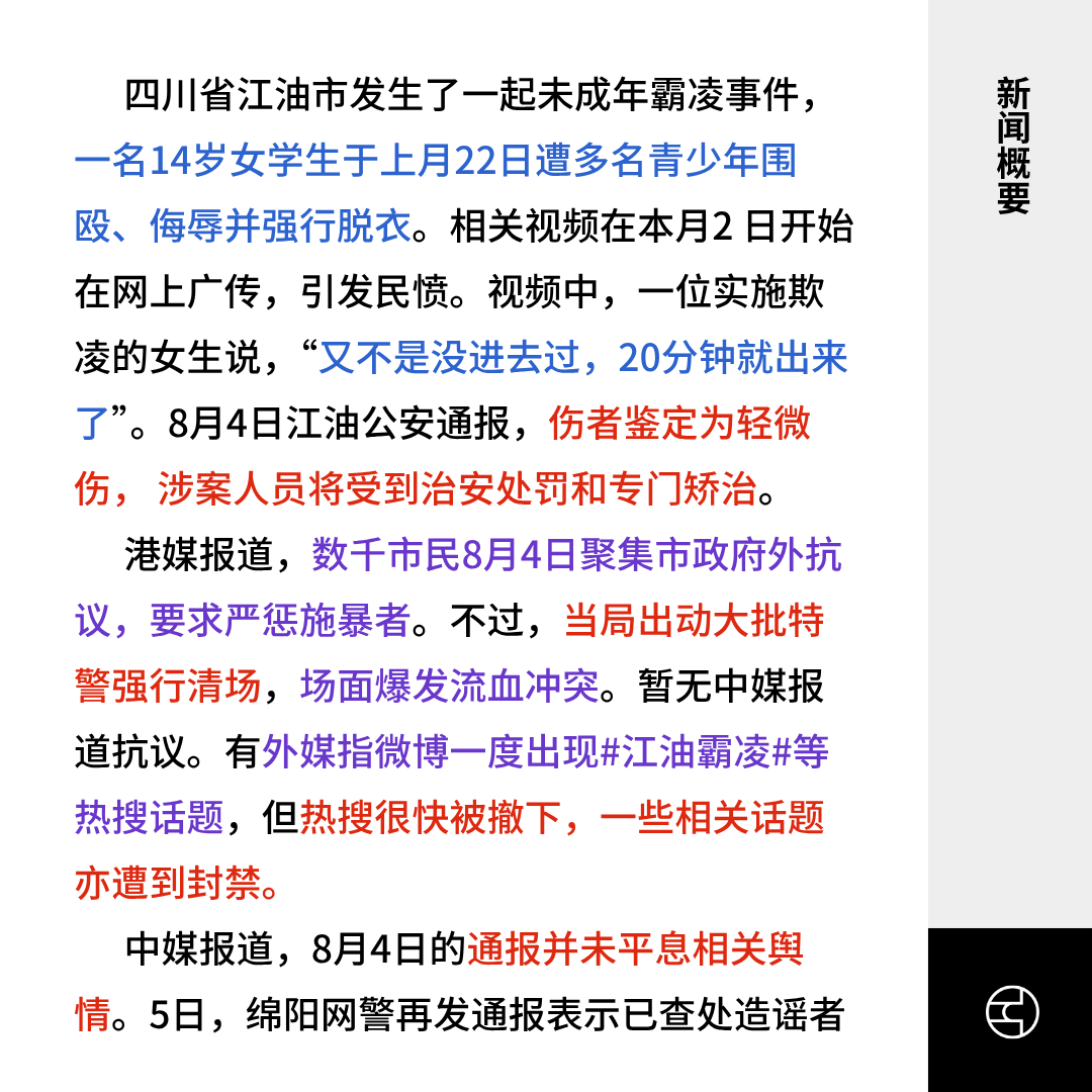 港媒报道,数千市民8月4日聚集市政府外抗议,要求严惩施暴者。不过,当局出动大批特警强行清场,场面爆发流血冲突。暂无中媒报道抗议。有外媒指微博一度出现#江油霸凌#等热搜话题,但热搜很快被撤下,一些相关话题亦遭到封禁。