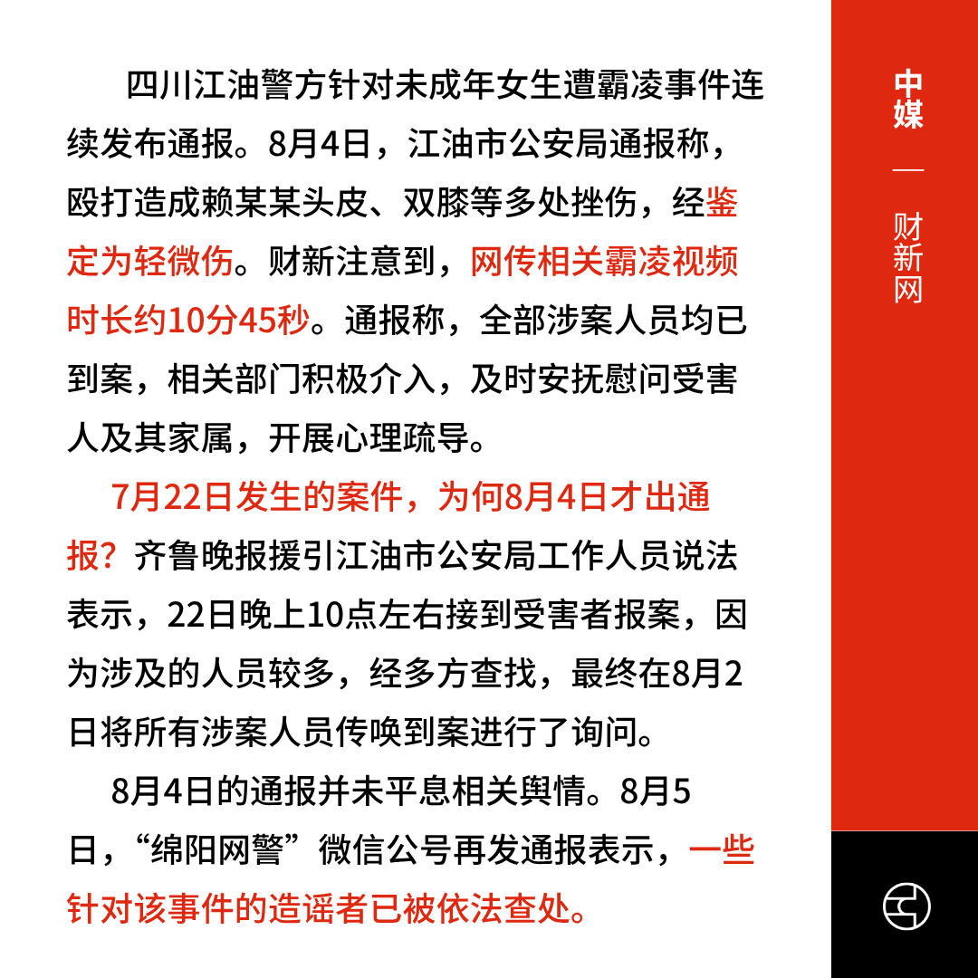 中媒报道,8月4日的通报并未平息相关舆情。5日,绵阳网警再发通报表示已查处造谣者。