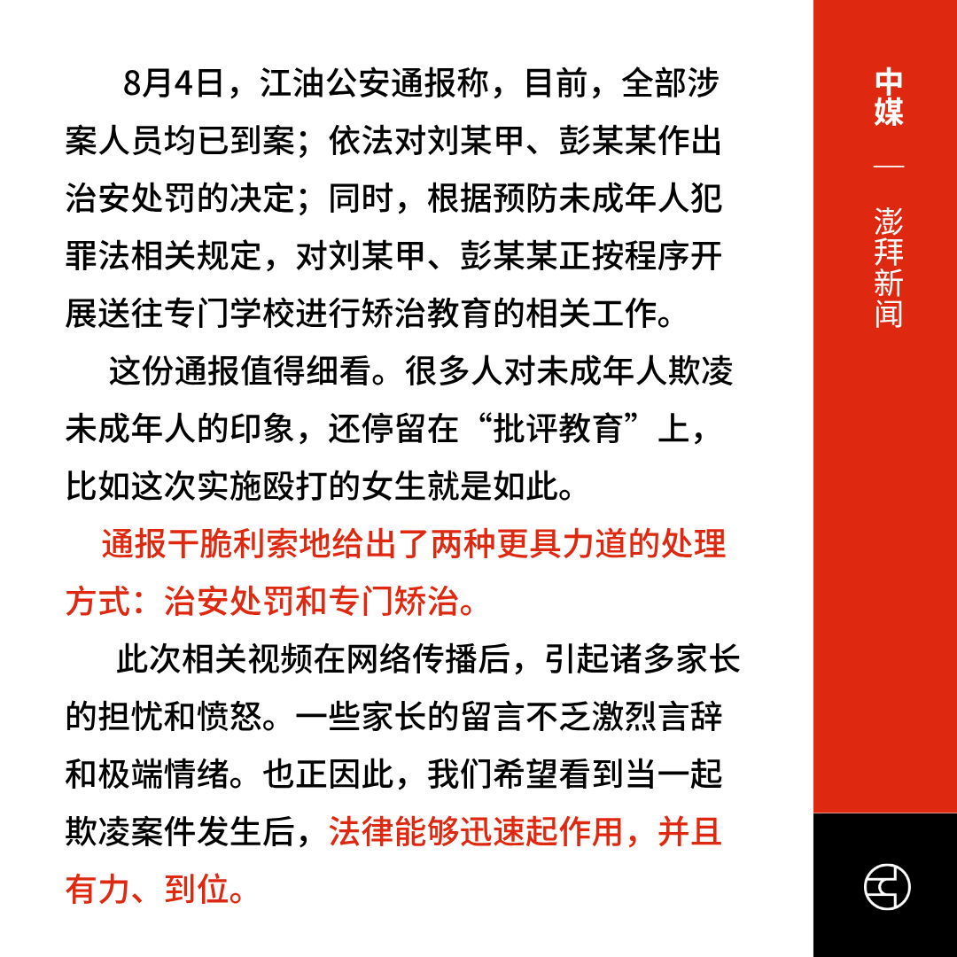 四川省江油市发生了一起未成年霸凌事件,一名14岁女学生于上月22日遭多名青少年围殴、侮辱并强行脱衣。相关视频在本月2 日开始在网上广传,引发民愤。视频中,一位实施欺凌的女生说,“又不是没进去过,20分钟就出来了”。8月4日江油公安通报,伤者鉴定为轻微伤, 涉案人员将受到治安处罚和专门矫治。