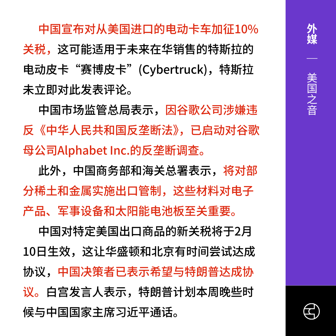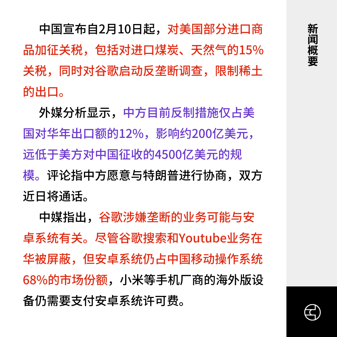 中国宣布自2月10日起,对美国部分进口商品加征关税,包括对进口煤炭、天然气的15%关税,同时对谷歌启动反垄断调查,限制稀土的出口。