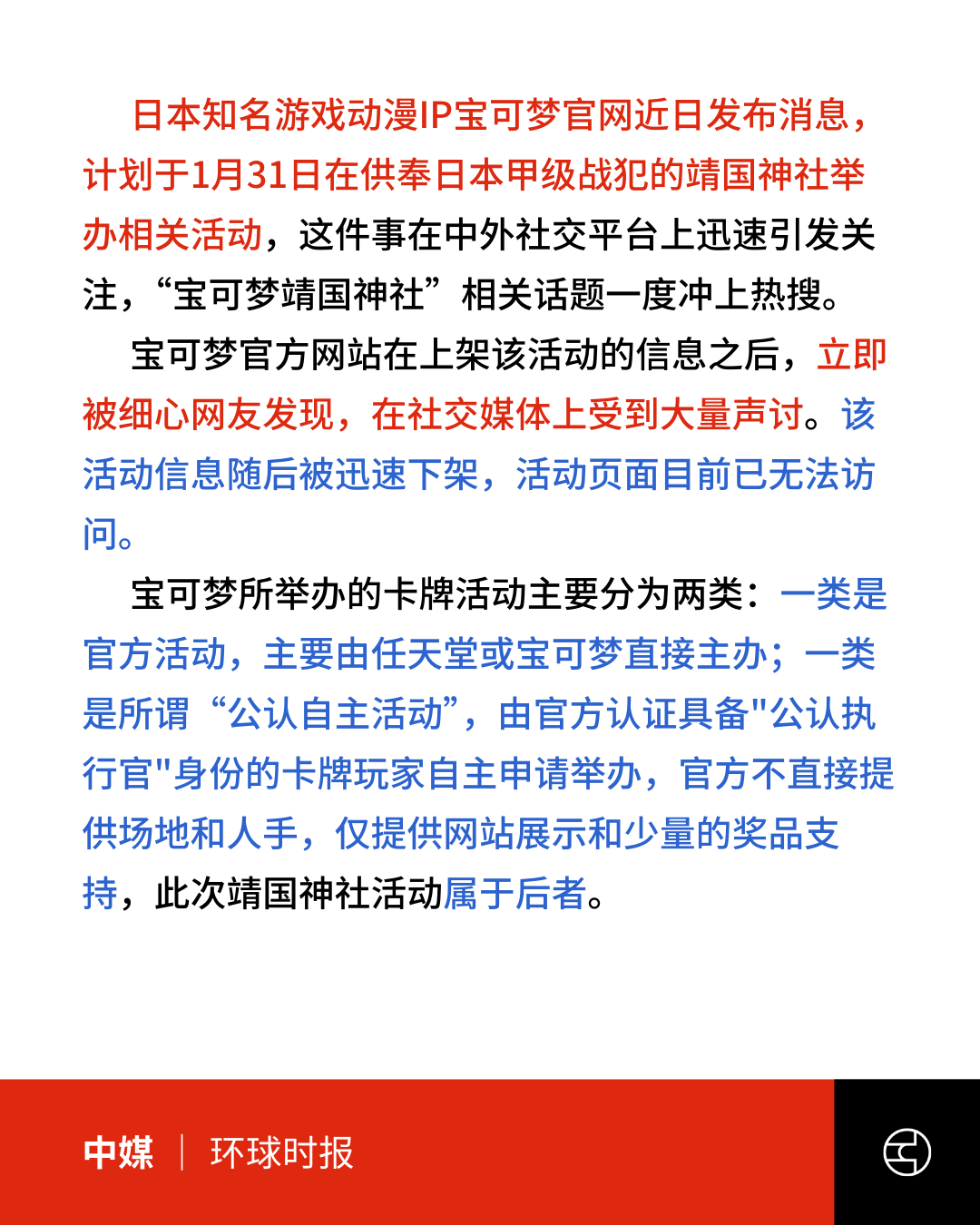 近日,日本知名IP宝可梦官网发布计划于1月31日在靖国神社举办卡牌活动的消息,因涉及侵略历史,迅速引发中国网络高度关注,对此骂声不断。
