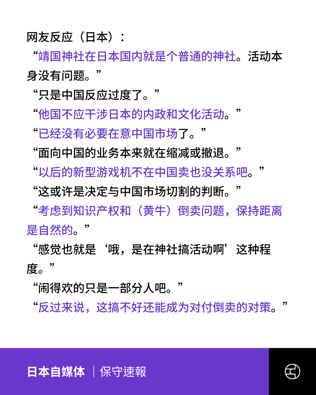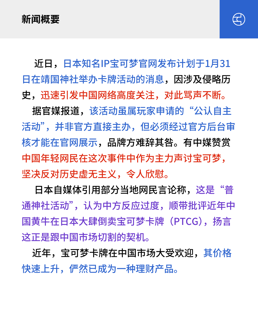 日本自媒体引用部分当地网民言论称,这是“普通神社活动”,认为中方反应过度,顺带批评近年中国黄牛在日本大肆倒卖宝可梦卡牌(PTCG),扬言这正是跟中国市场切割的契机。