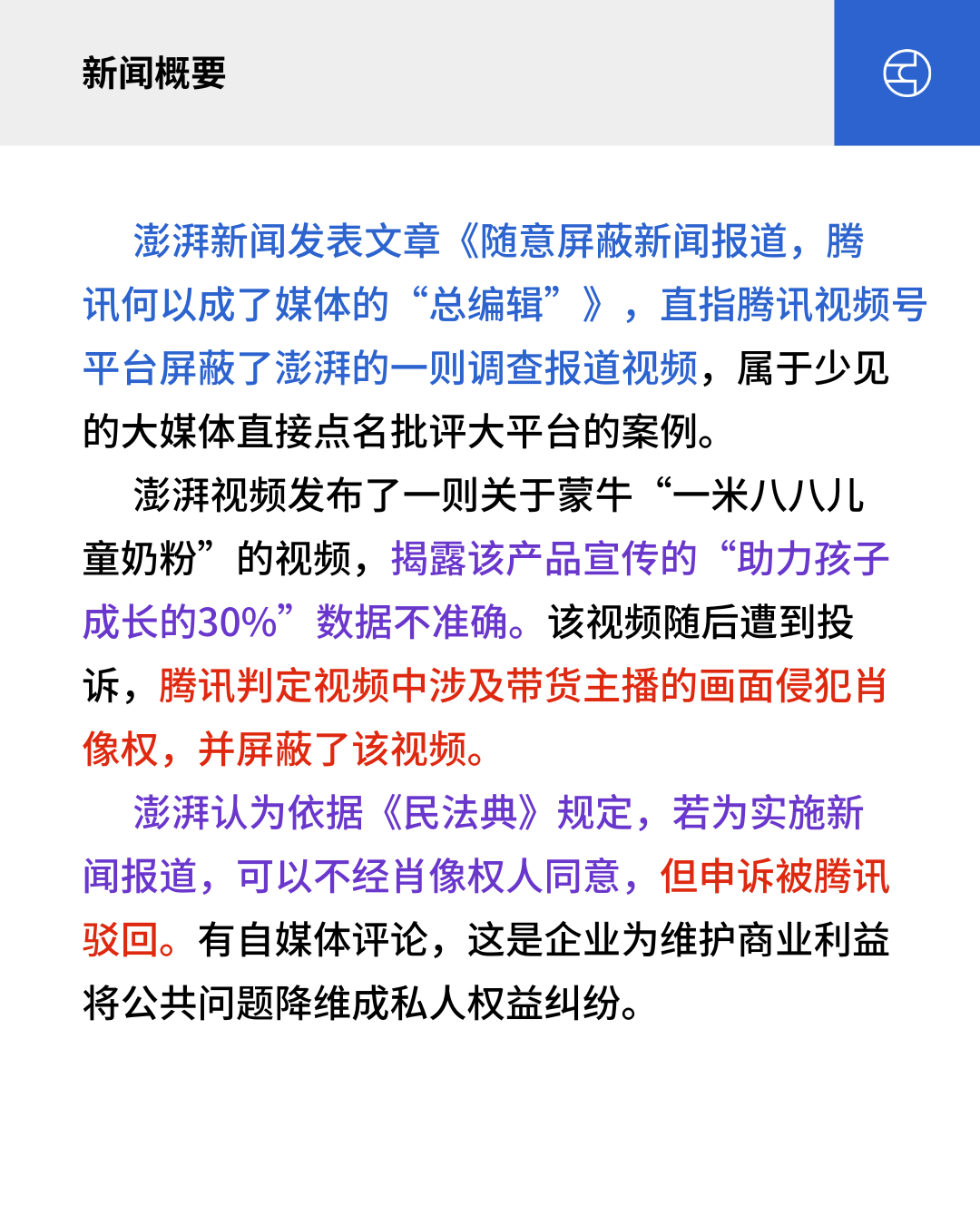 澎湃视频发布了一则关于蒙牛“一米八八儿童奶粉”的视频,揭露该产品宣传的“助力孩子成长的30%”数据不准确。该视频随后遭到投诉,腾讯判定视频中涉及带货主播的画面侵犯肖像权,并屏蔽了该视频。