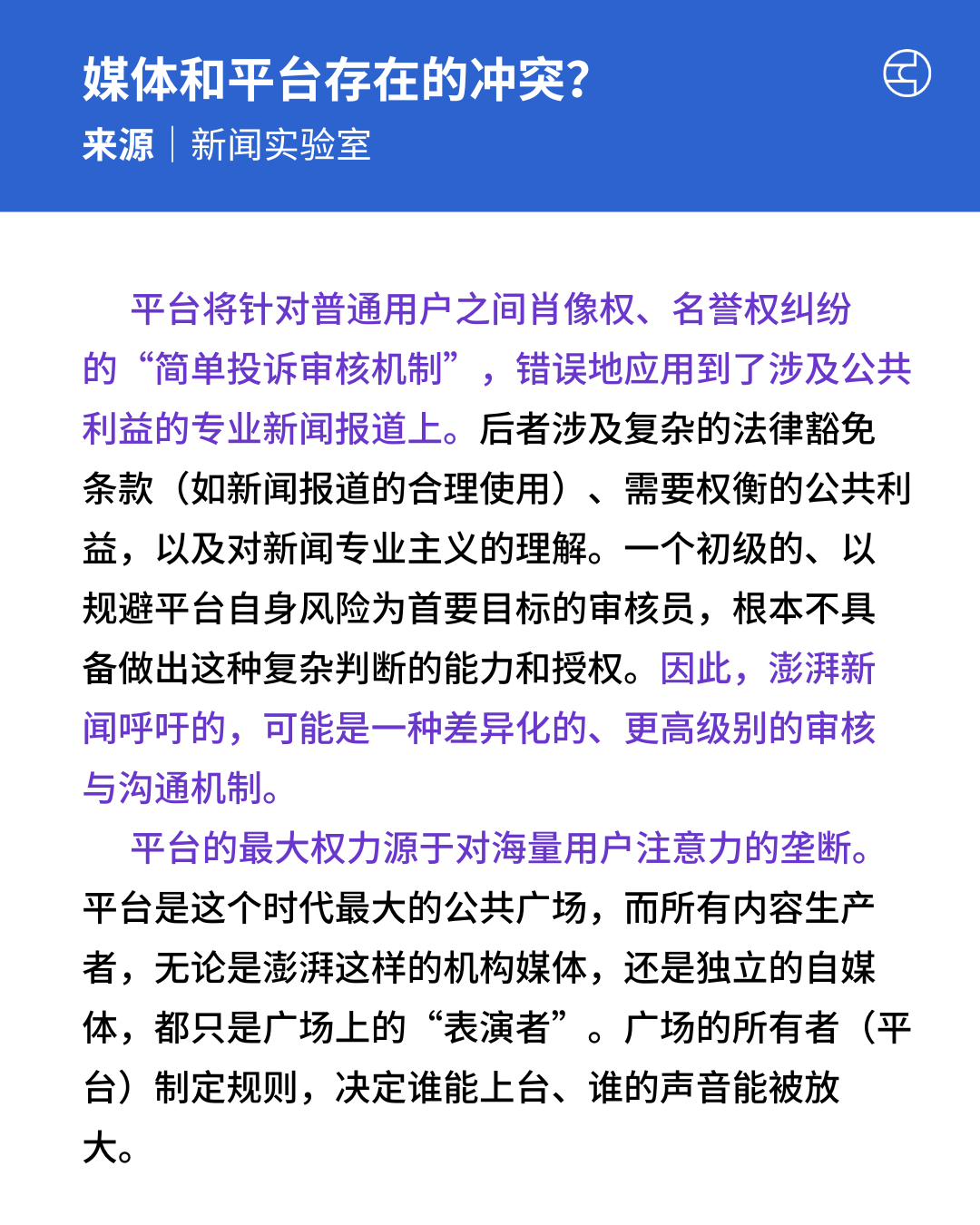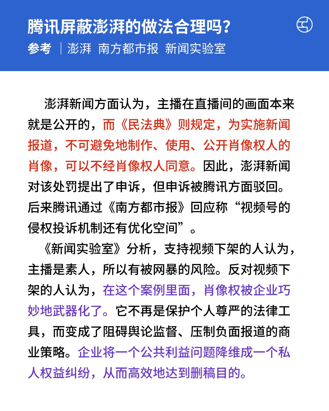 澎湃认为依据《民法典》规定,若为实施新闻报道,可以不经肖像权人同意,但申诉被腾讯驳回。有自媒体评论,这是企业为维护商业利益将公共问题降维成私人权益纠纷。