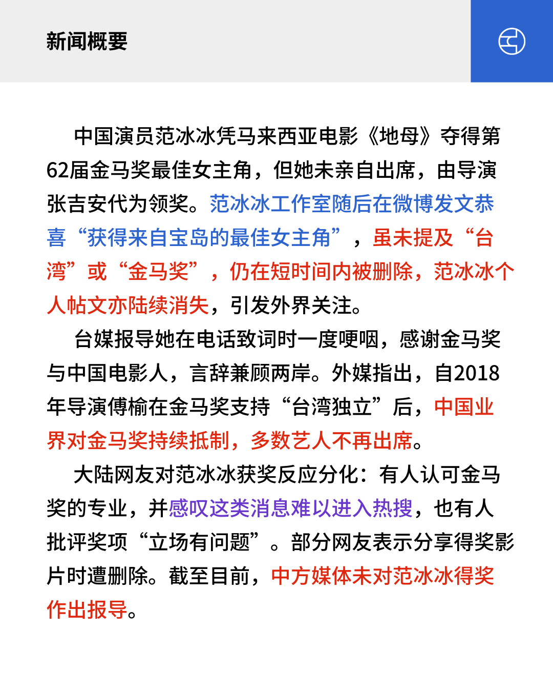 中国演员范冰冰凭马来西亚电影《地母》夺得第62届金马奖最佳女主角,但她未亲自出席,由导演张吉安代为领奖。范冰冰工作室随后在微博发文恭喜“获得来自宝岛的最佳女主角”,虽未提及“台湾”或“金马奖”,仍在短时间内被删除,范冰冰个人帖文亦陆续消失,引发外界关注。