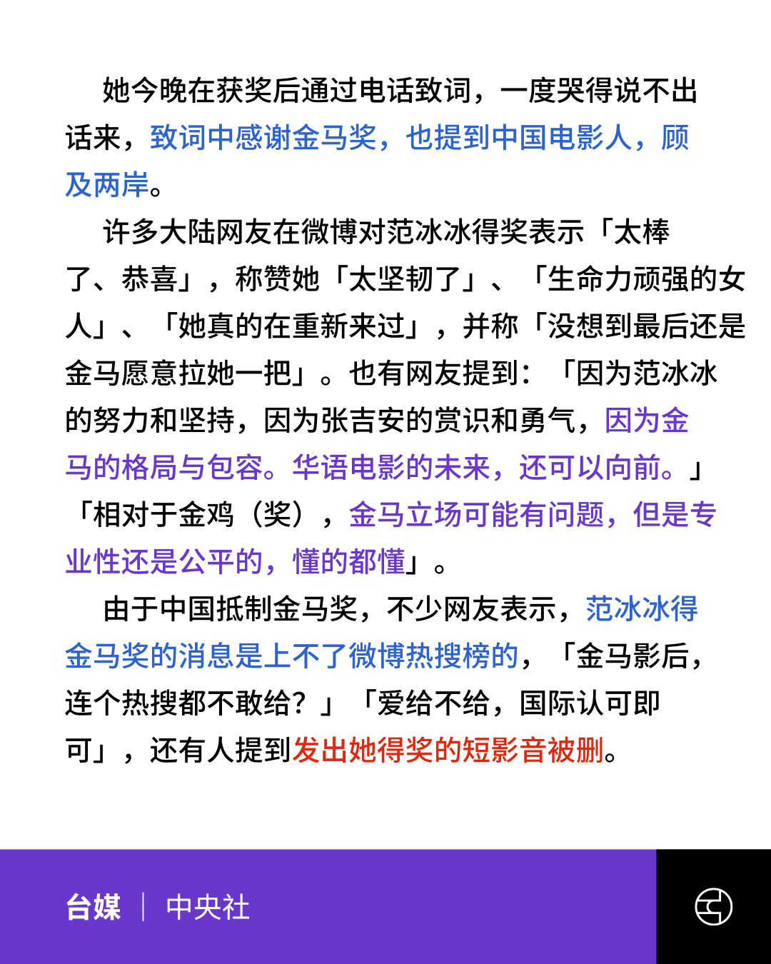 大陆网友对范冰冰获奖反应分化:有人认可金马奖的专业,并感叹这类消息难以进入热搜,也有人批评奖项“立场有问题”。部分网友表示分享得奖影片时遭删除。截至目前,中方媒体未对范冰冰得奖作出报导。