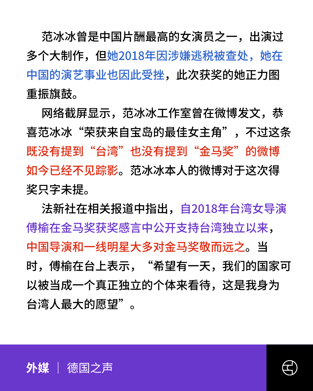 《德国之声》范冰冰荣获金马影后 “恭喜冰冰”的微博被删