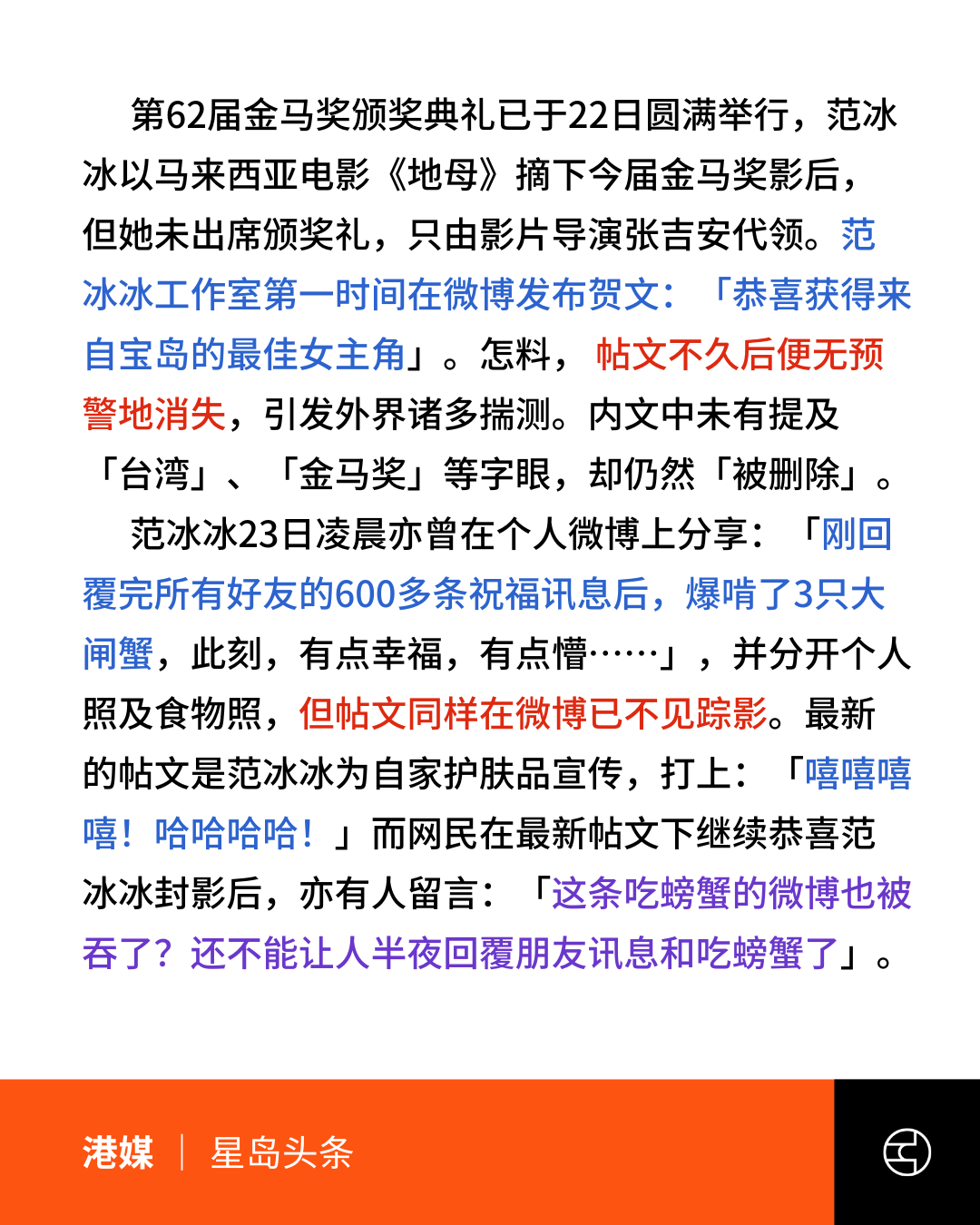 《星岛头条》范冰冰夺影后「被消失」 微博庆祝文遭全删惹揣测近年因逃税疑被封杀绝迹内地娱乐圈