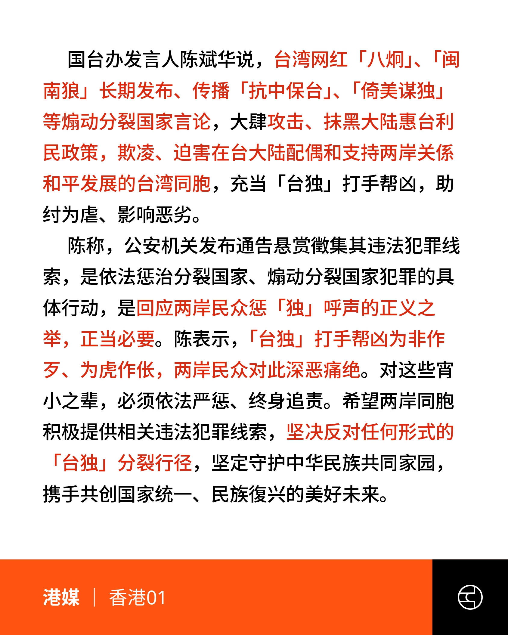 《香港01》台网红八炯、闽南狼被泉州警方徵集犯罪线索 国台办:正当必要