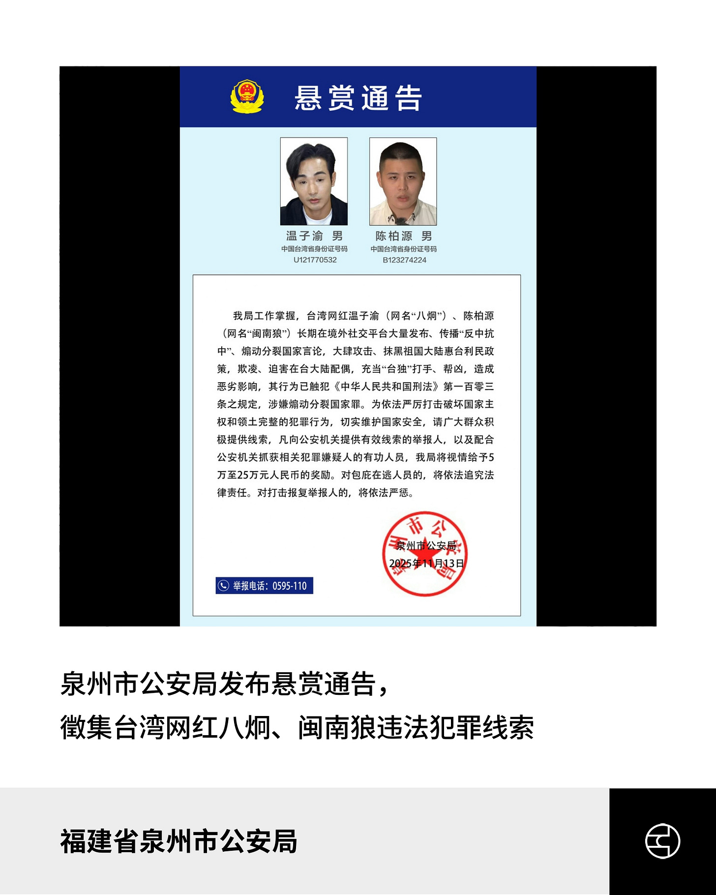 泉州市公安局发布悬赏通告,征集台湾网红“八炯”(温子渝)与“闽南狼”(陈柏源)的违法犯罪线索,指两人涉嫌从事“台独”分裂活动。