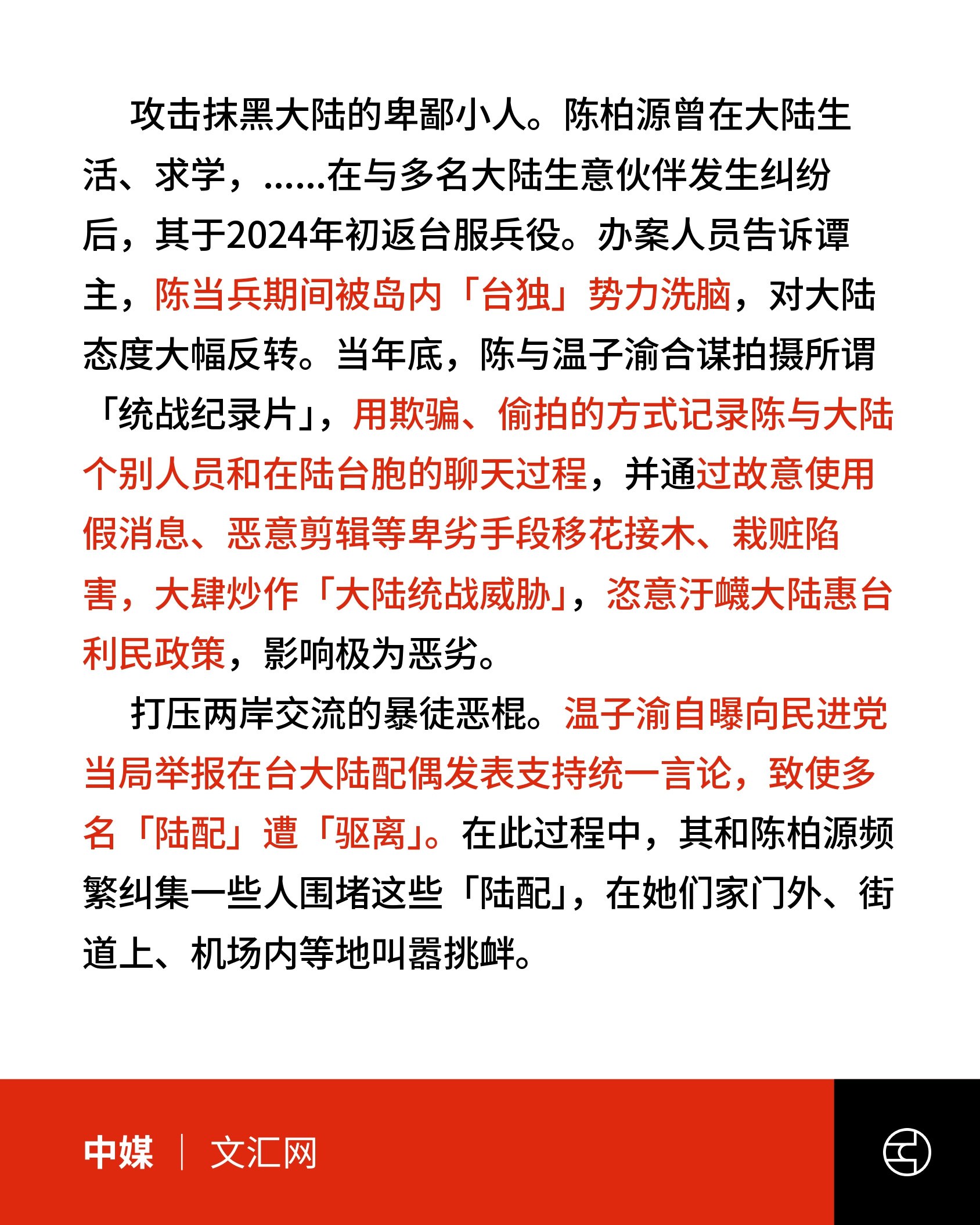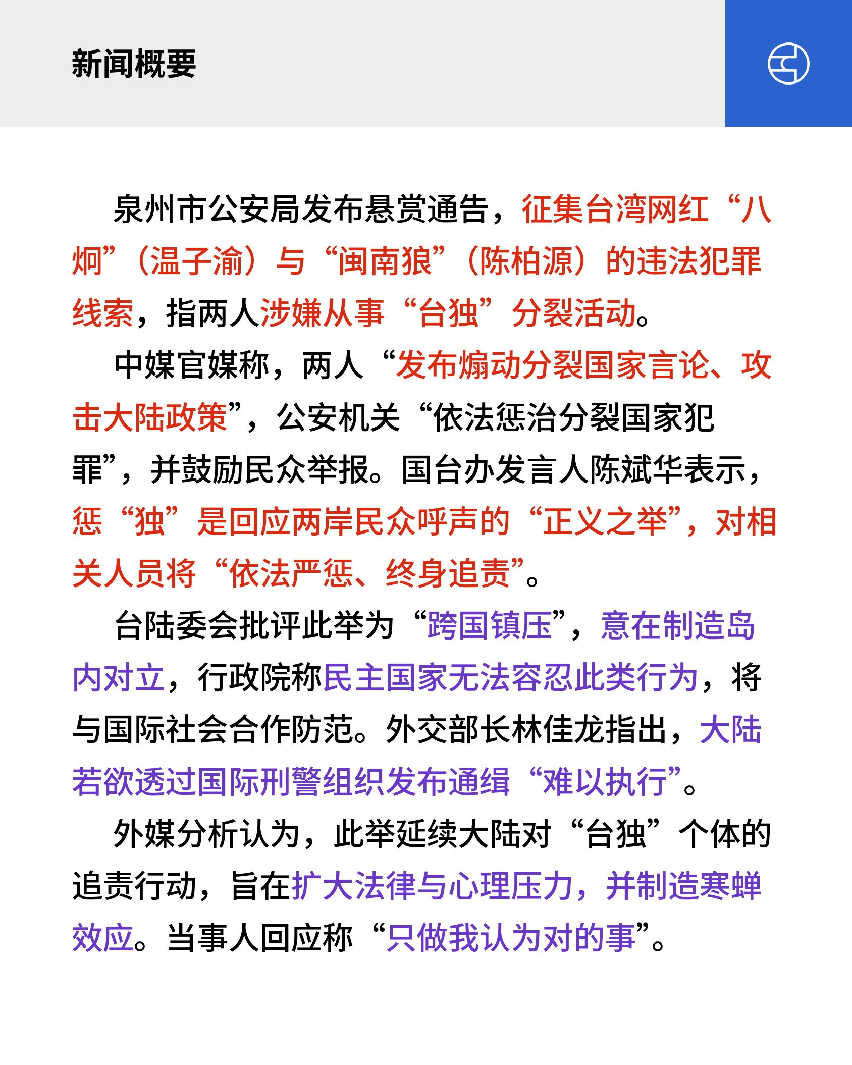 中媒官媒称,两人“发布煽动分裂国家言论、攻击大陆政策”,公安机关“依法惩治分裂国家犯罪”,并鼓励民众举报。国台办发言人陈斌华表示,惩“独”是回应两岸民众呼声的“正义之举”,对相关人员将“依法严惩、终身追责”。