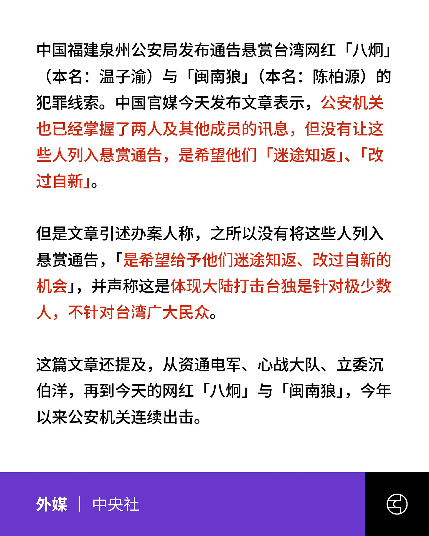 《BBC》从沈伯洋到八炯、闽南狼:北京为何对这些台湾人发出「红色通缉令」?