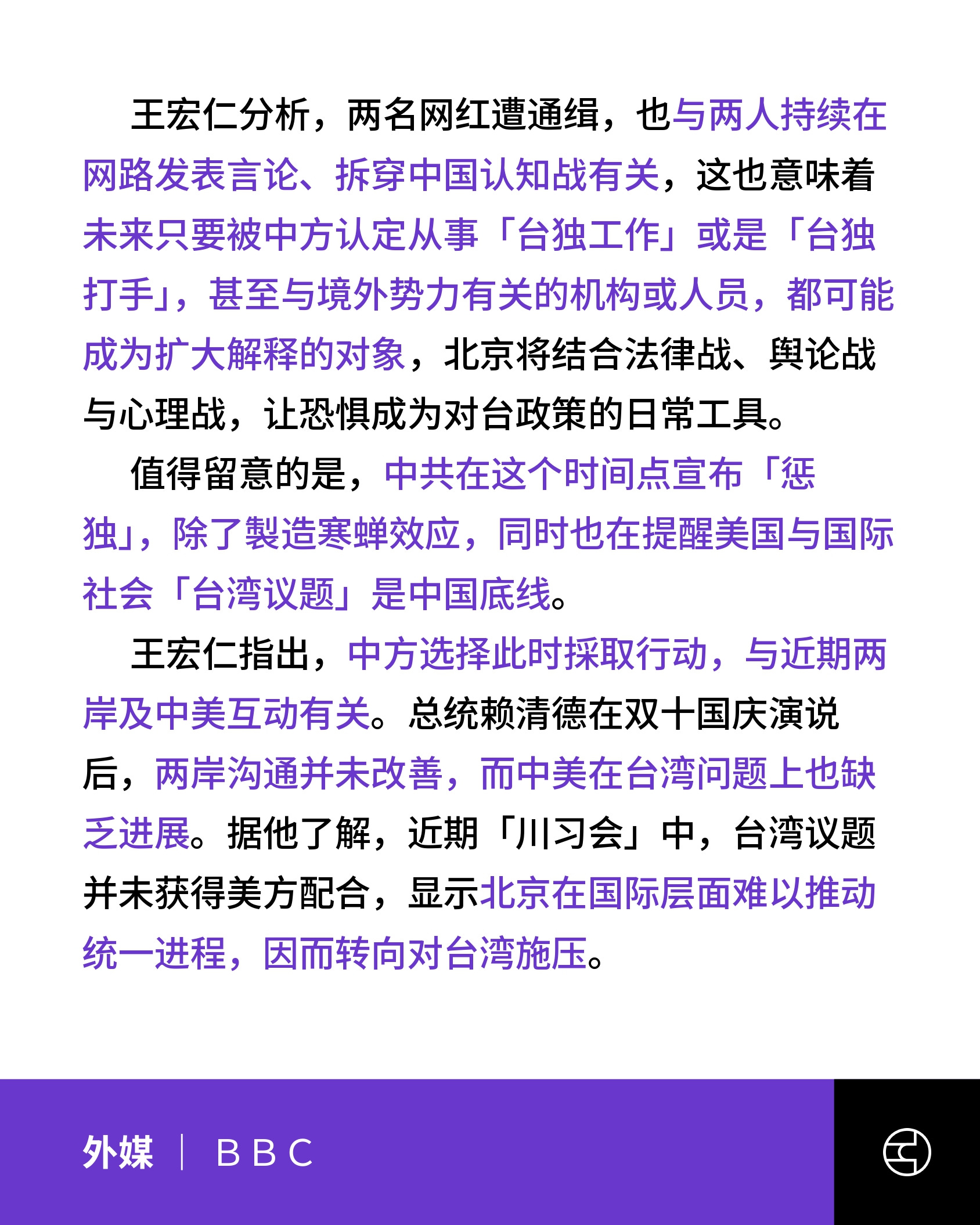 外媒分析认为,此举延续大陆对“台独”个体的追责行动,旨在扩大法律与心理压力,并制造寒蝉效应。当事人回应称“只做我认为对的事”。