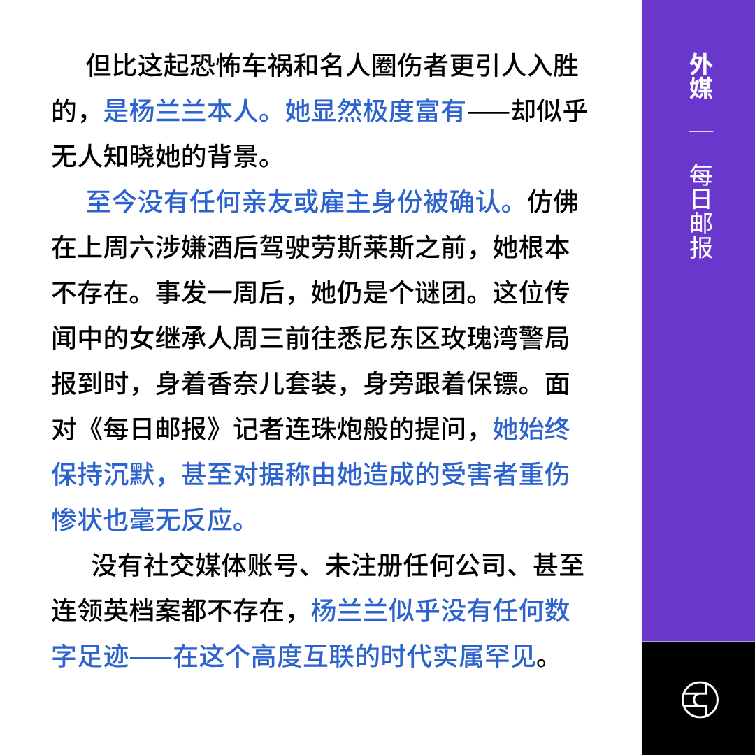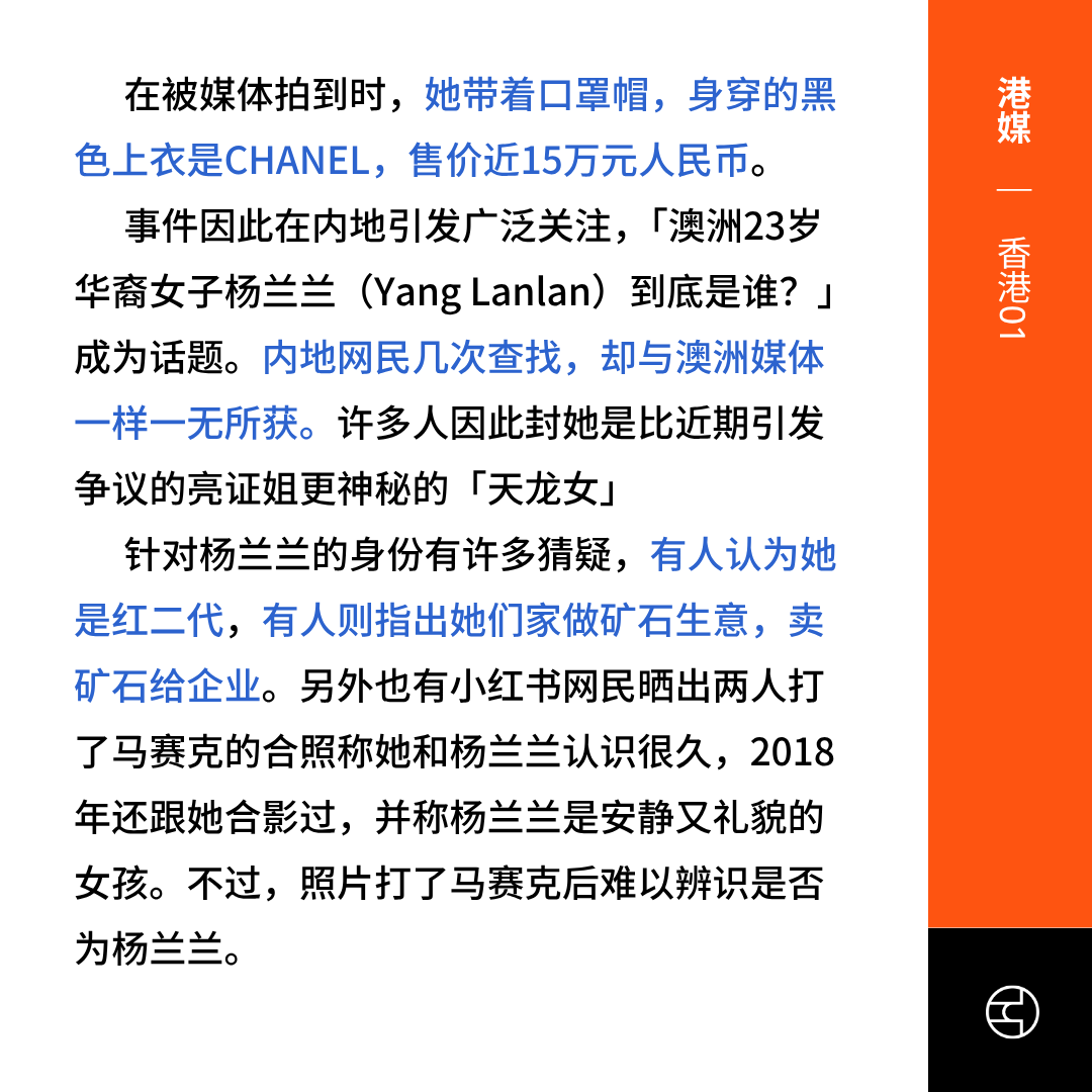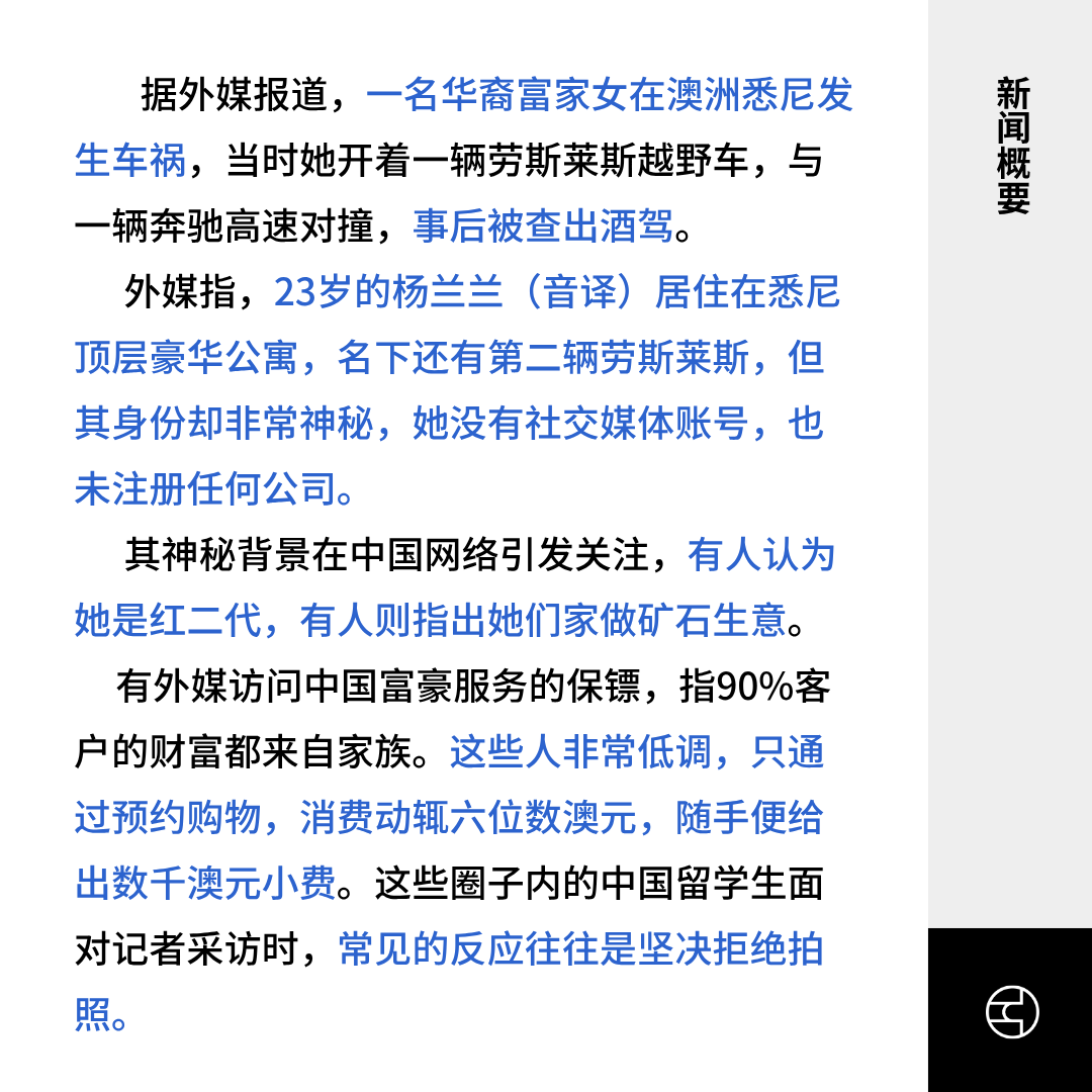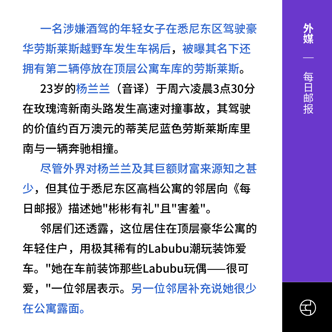 外媒指,23岁的杨兰兰(音译)居住在悉尼顶层豪华公寓,名下还有第二辆劳斯莱斯,但其身份却非常神秘,她没有社交媒体账号,也未注册任何公司。